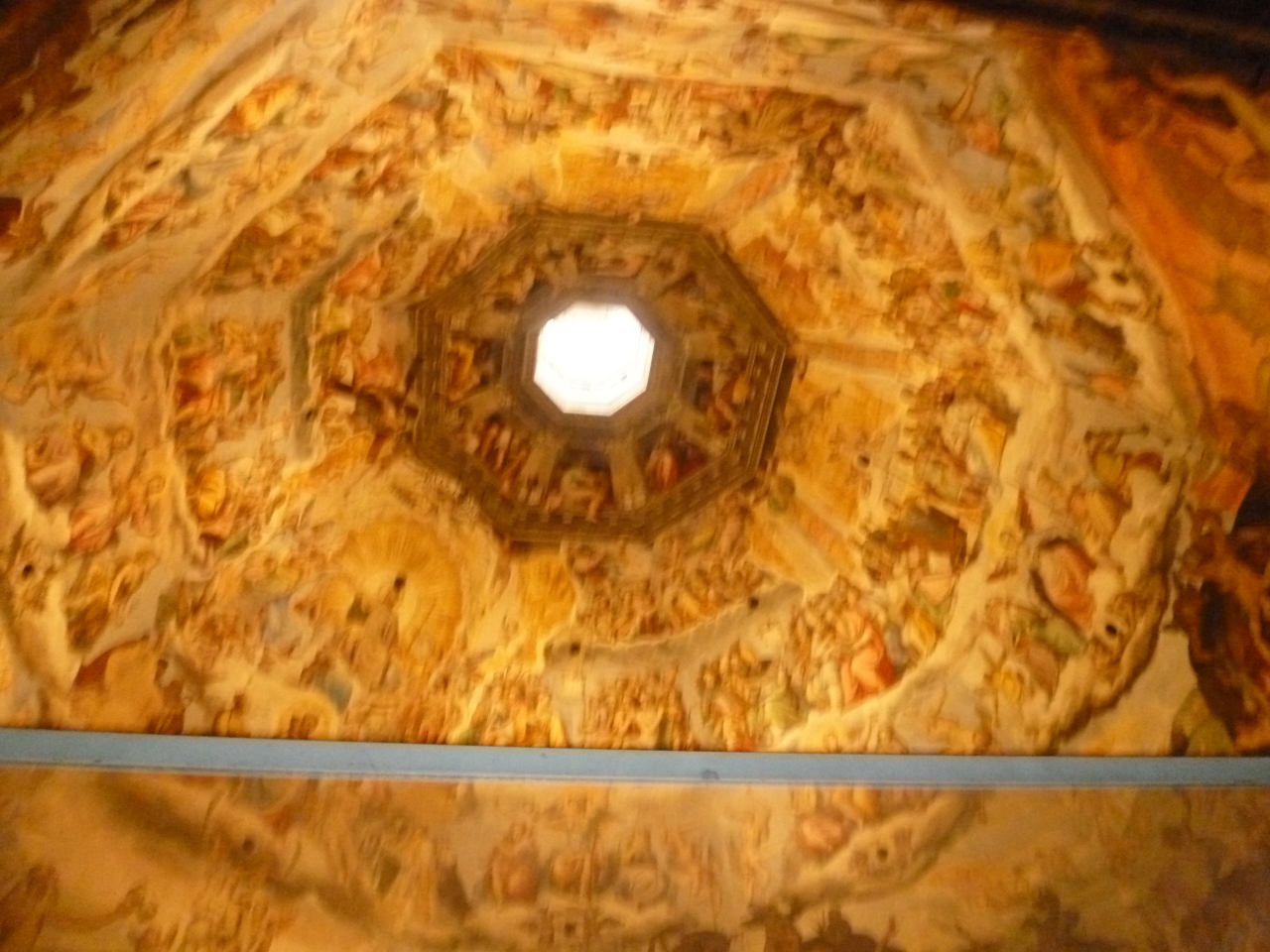 ドウモのクッポラに登った。まず朝、人がならんでいて、ドウモの入場入口だった。中を見学。無料。その時お金を払っている所があり、イヤホンガイドだったらしい。入口で質問して、登りたいと言ったら外左と言われた。ドウモの周りを一周して入口を見つけた。当日は、雨がパラパラ降っていた。朝9時半頃、誰も並んでいなかった。階段を上り途中2箇所ぐらいクッポラ乃天井画をぐるっと見学する。そして通路階段が狭くなりついに屋上外へ。景色は、抜群。しばらく涼しい風にあたりながら眺望を楽しんだ。途中の階段に窓というか穴が開いている所で深呼吸して、空気を体に取り入れるといいと思う。前回フィレンツェに来た時登れなかったので満足した。昼頃通ったらかなり並んでいた。