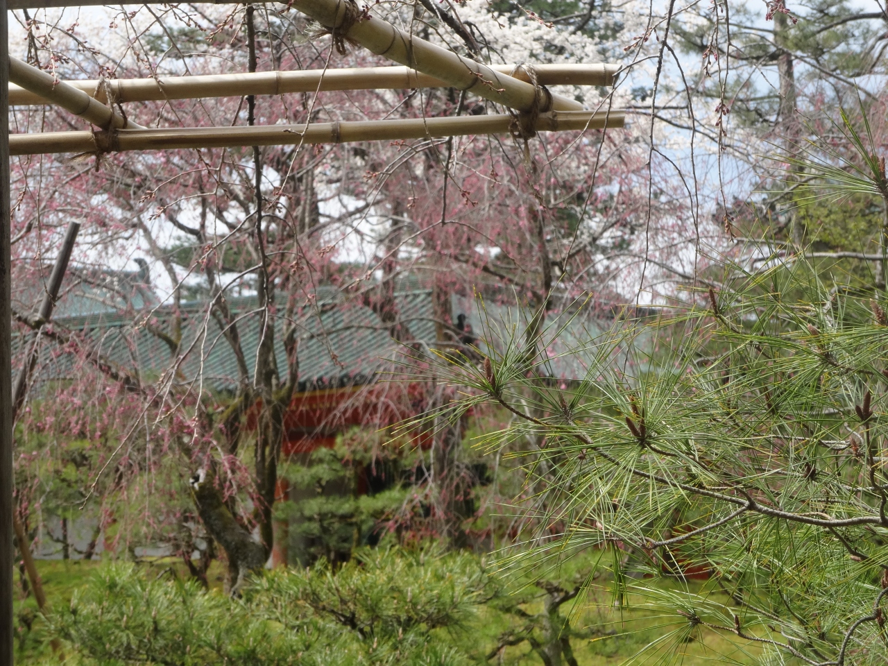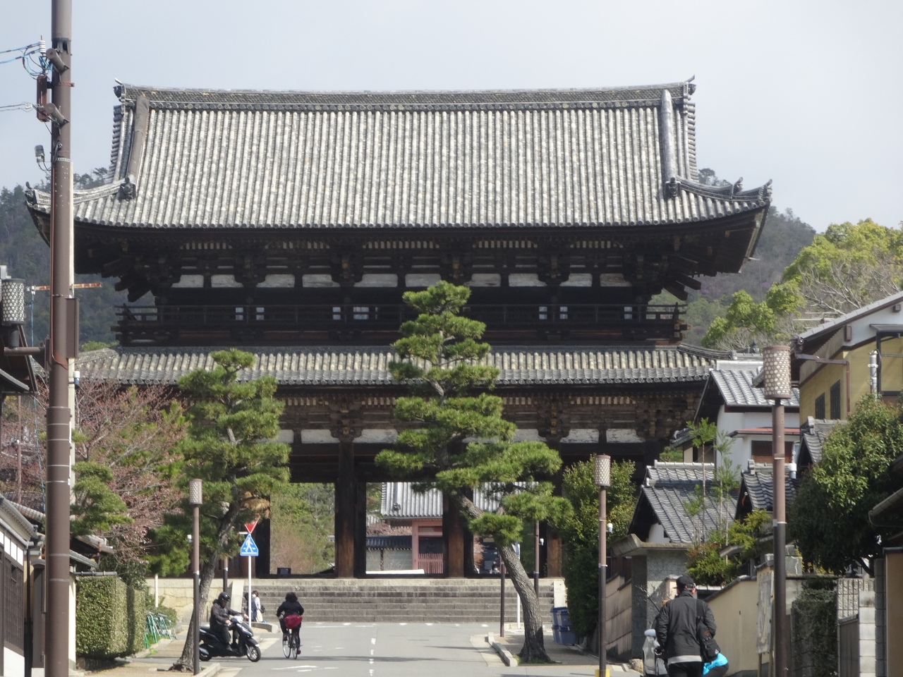 仁和寺が駅を降りてすぐ見えます。御室の桜と言われていて、木の背丈が低いことと鼻が低いことをかけて美人じゃないこと言われています。御室のさくらは、山桜でソメイヨシノ