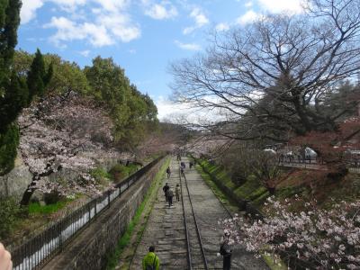 南禅寺近くの疎水跡からずっと堤を歩きました。桜がかなり咲いていました。多くの人が歩いています。線路後にいしがゴロゴロしていて、歩きにくく、ずっと続いて、戻ってくる人も多かったです。このまま歩き続けて、戻るのは、嫌だなと思っていると、下に降りられるところが、ありました。堤の東側でした。そこからすぐ、ねじりまんぼがあり、トンネルみたいなのを抜けると西側に出られます。すると蹴上駅がすぐありました。