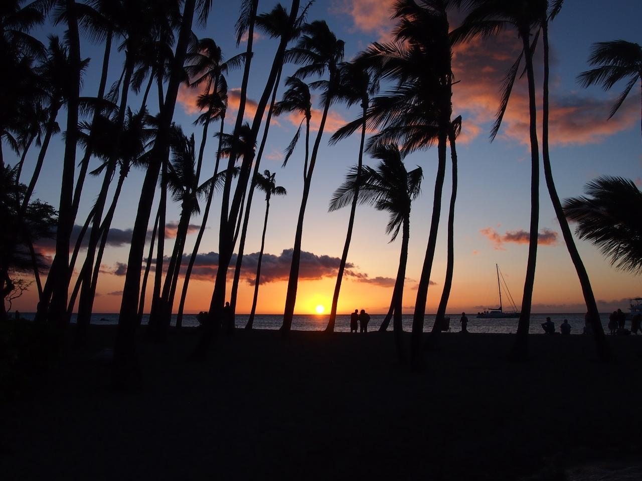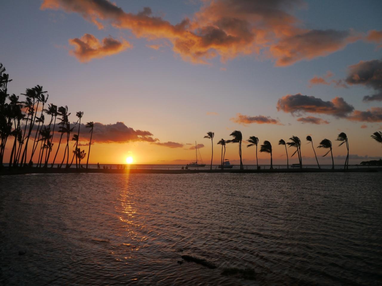 ビーチ手前のフィッシュポンドに夕日が反射して、とっても幻想的。ヤシの木が黒いシルエットになって、どんなに適当に写真を撮っても絵になります。