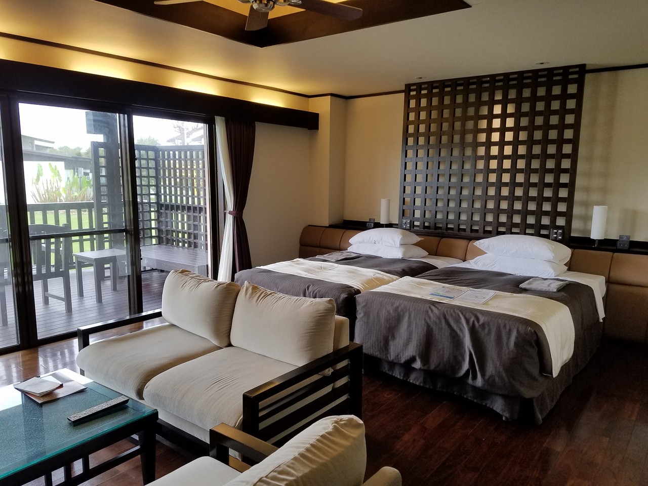 部屋はグランドコテージ。部屋自体は特に可もなく不可もなく。ただ残念な事に、上の階にはモラルに欠けた子供連れが。夜遅くまでと朝早くから足音以上の騒音が。2日目の朝は6時前に上の階からの騒音で目が覚めました。まぁこれはホテルの問題ではなく利用者のモラルの問題。残念な方はどこにでもいるので運が悪かったと思うしか。3日目の夜中、寝付けずにバルコニーで波音をBGMに読書をしたのは素敵な時間でした。