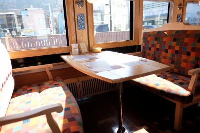 事前に席を予約しておきました。電車の中とは思えない、カフェみたいな席...