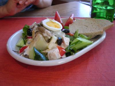 メニューがハングル文字のものしかなかったため、カンで選びましたが、鶏肉とサラダ野菜とを混ぜた料理などヨーロッパ風の料理が多いように感じました。味付けは若干濃いかな。ほとんどの人が韓国人で観光客のような感じの人は見かけませんでした。