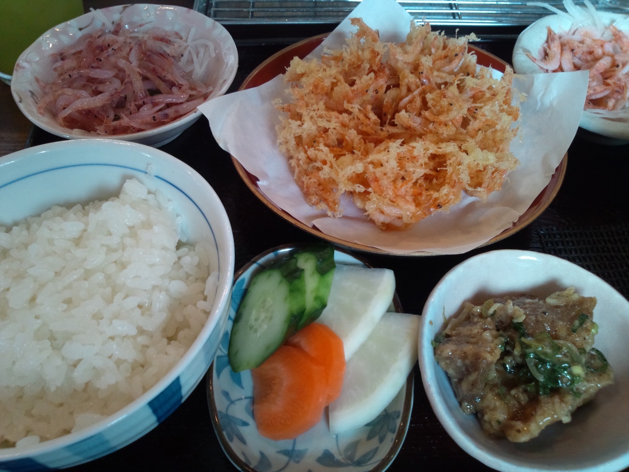 さっくさくの桜えびたーっぷりのかきあげと、釜揚げ、生の桜エビが。