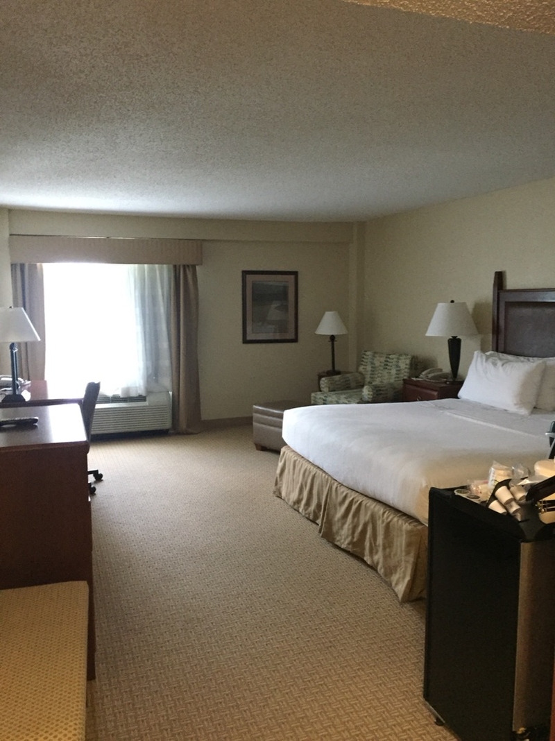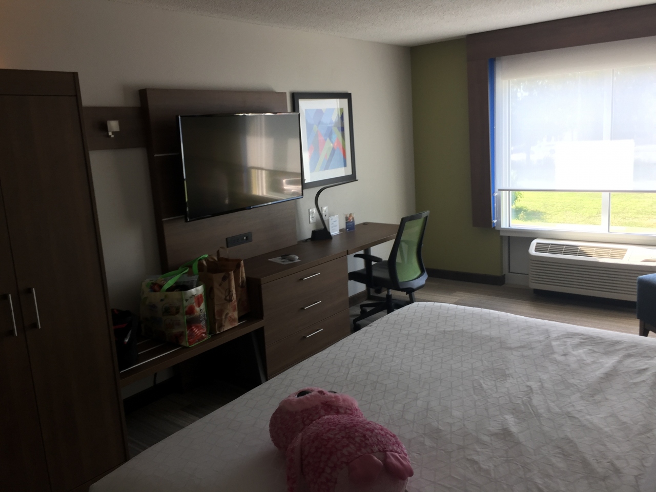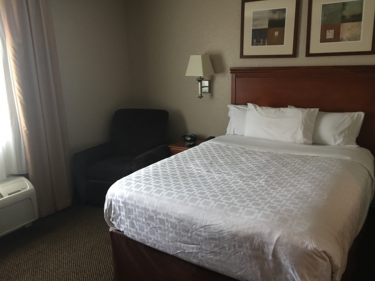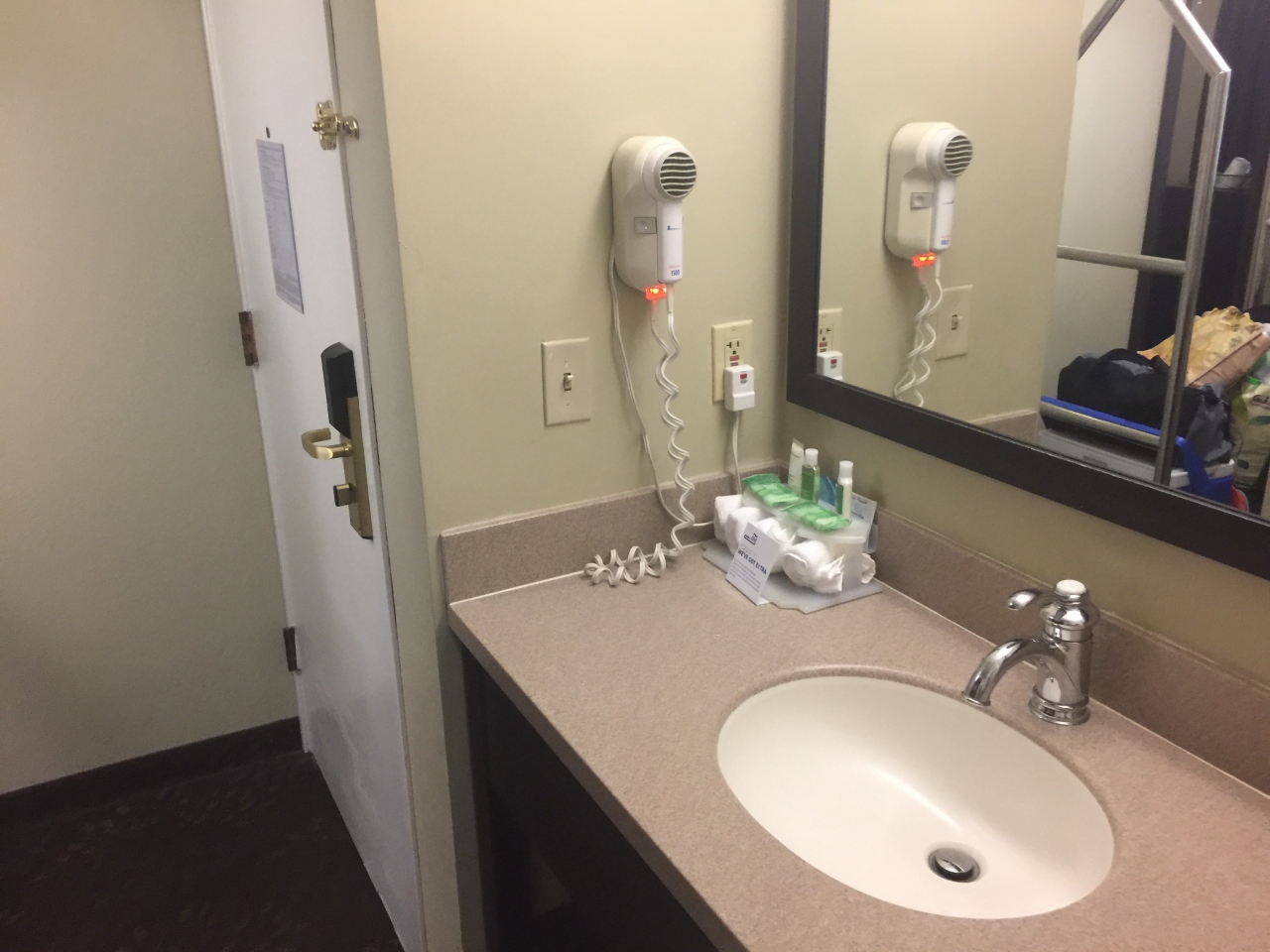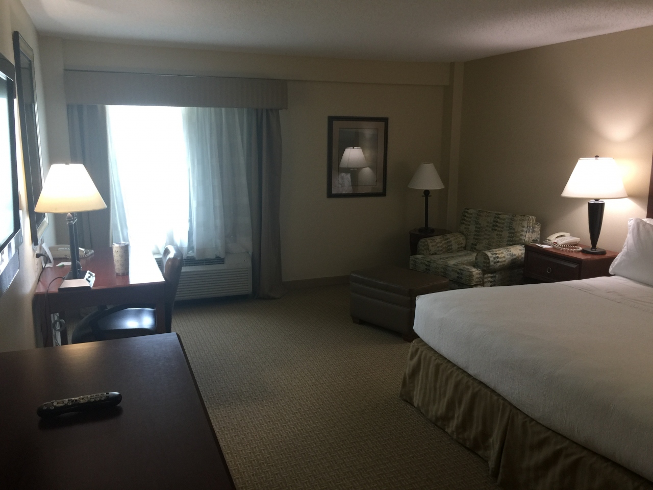 朝食付きで駐車場無料で良いのですが、夕食は近くにレストランが無いで、どこかで買ってからホテルに来るか、ハイウェイの逆側にあるサブウェイかコンビニで買うしかありません。それ以外はホリデイインのスタンダードです。