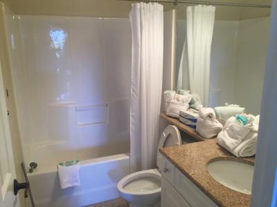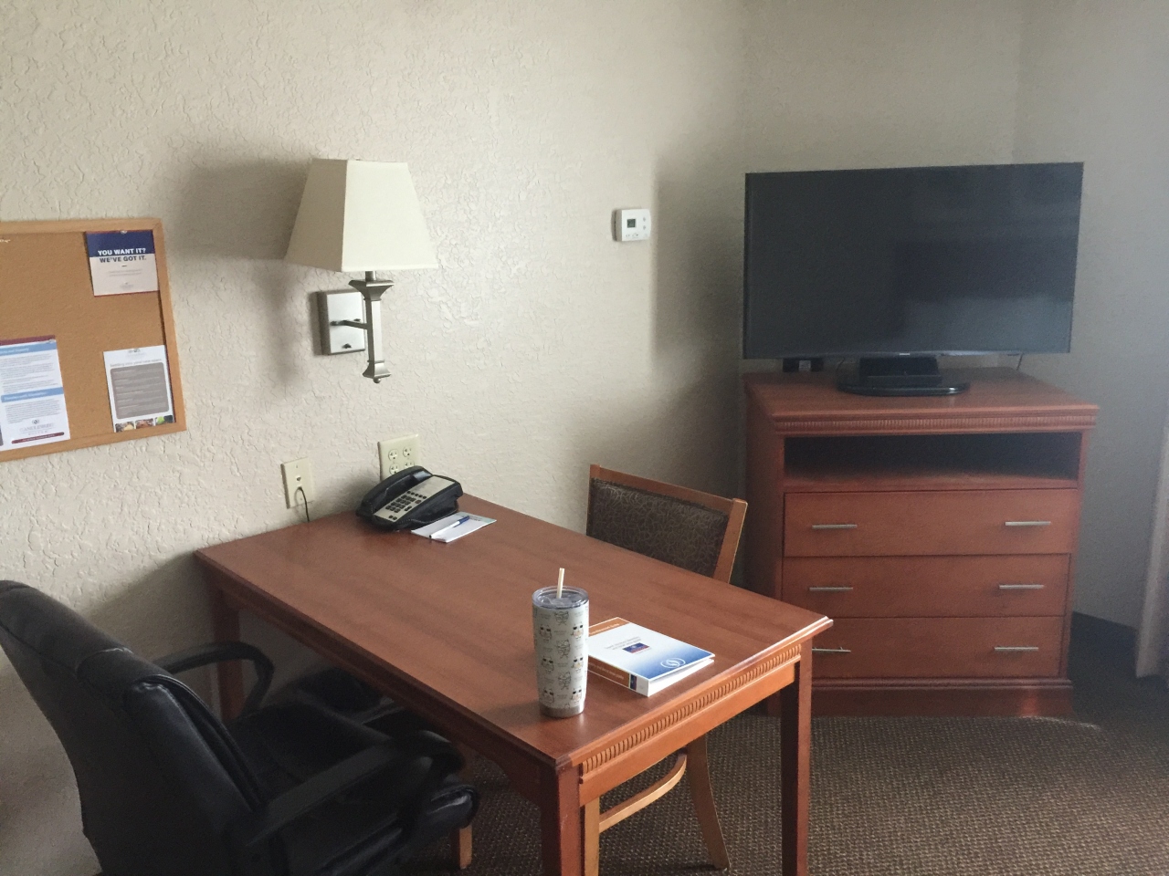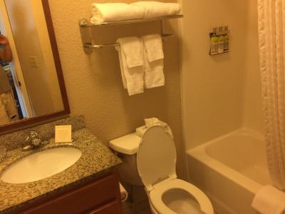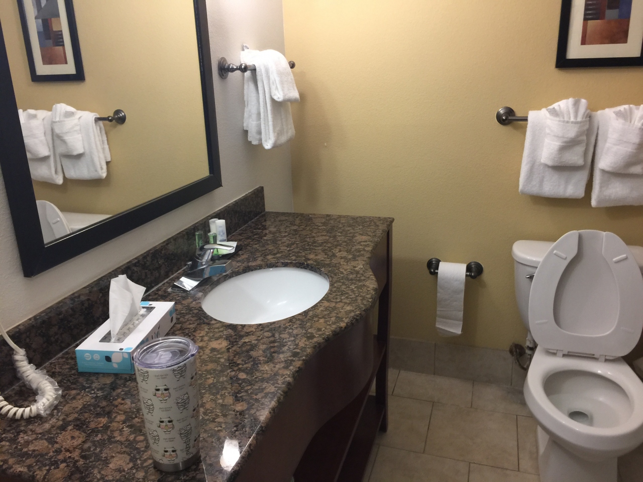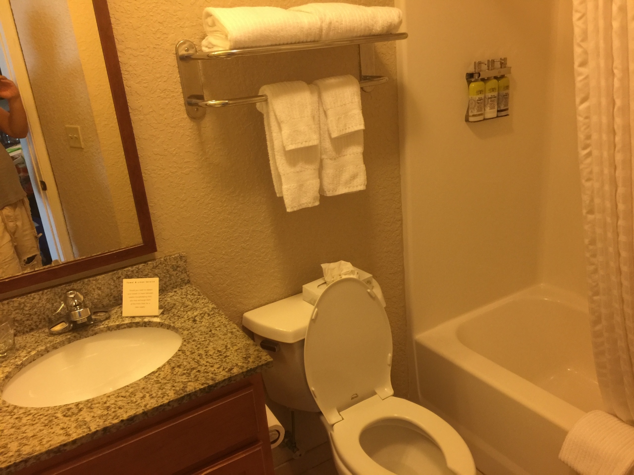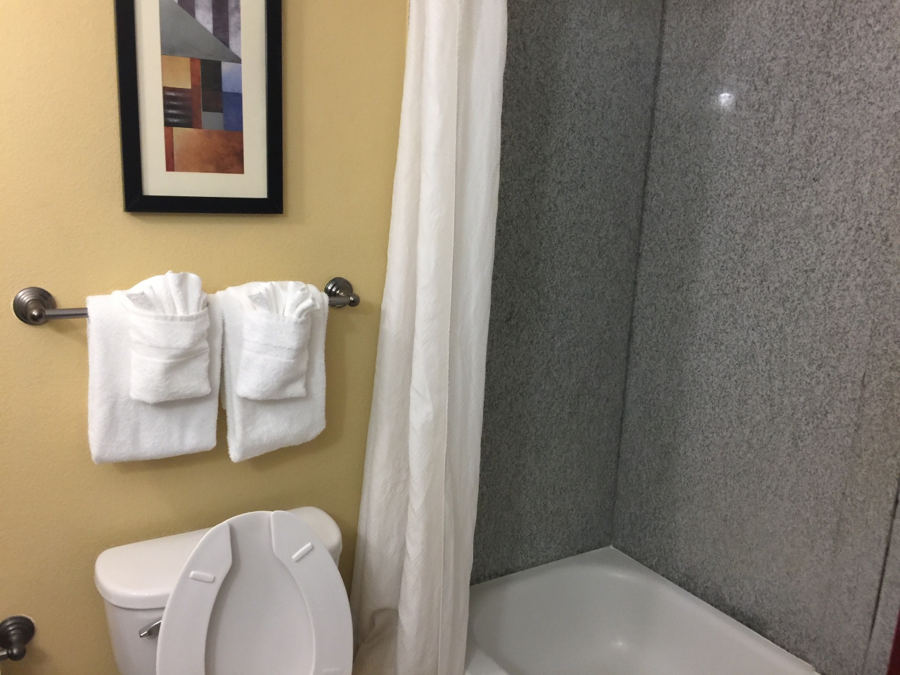 ダウンタウン地区ではなく、エアポート地区です。車があれば駐車場無用でダウンタウンアクセスも30分あれば問題ないでしょう。朝食付きでビジネスホテルのような部屋の大きさでした。洗面台がバスルームの外にあるので、鏡が曇る心配はありませんでした。