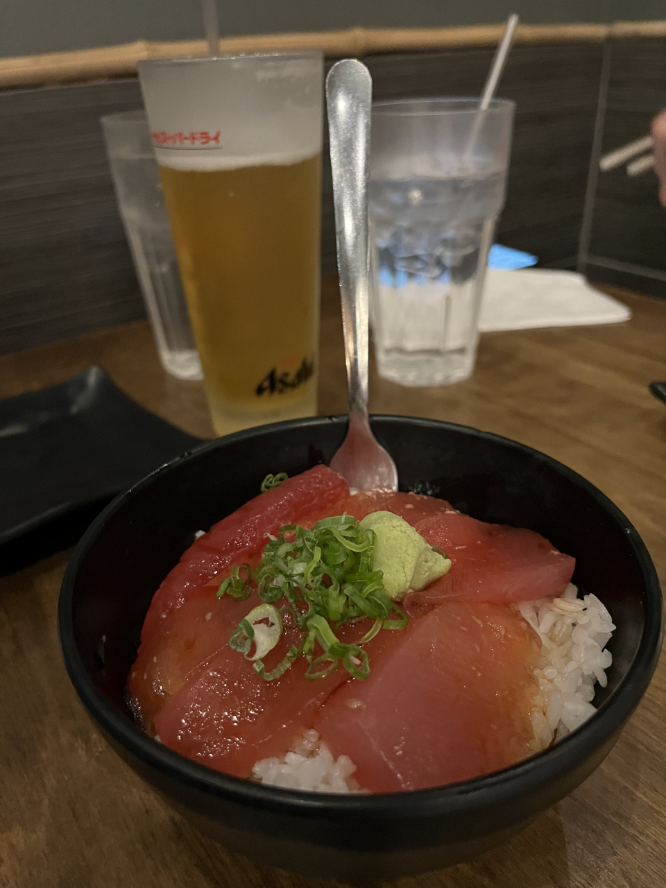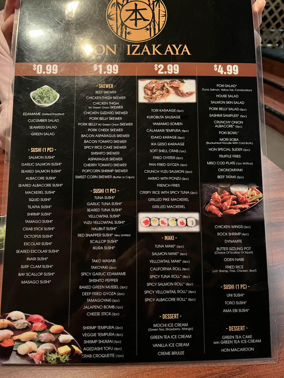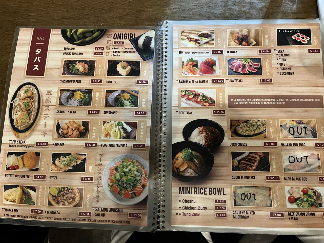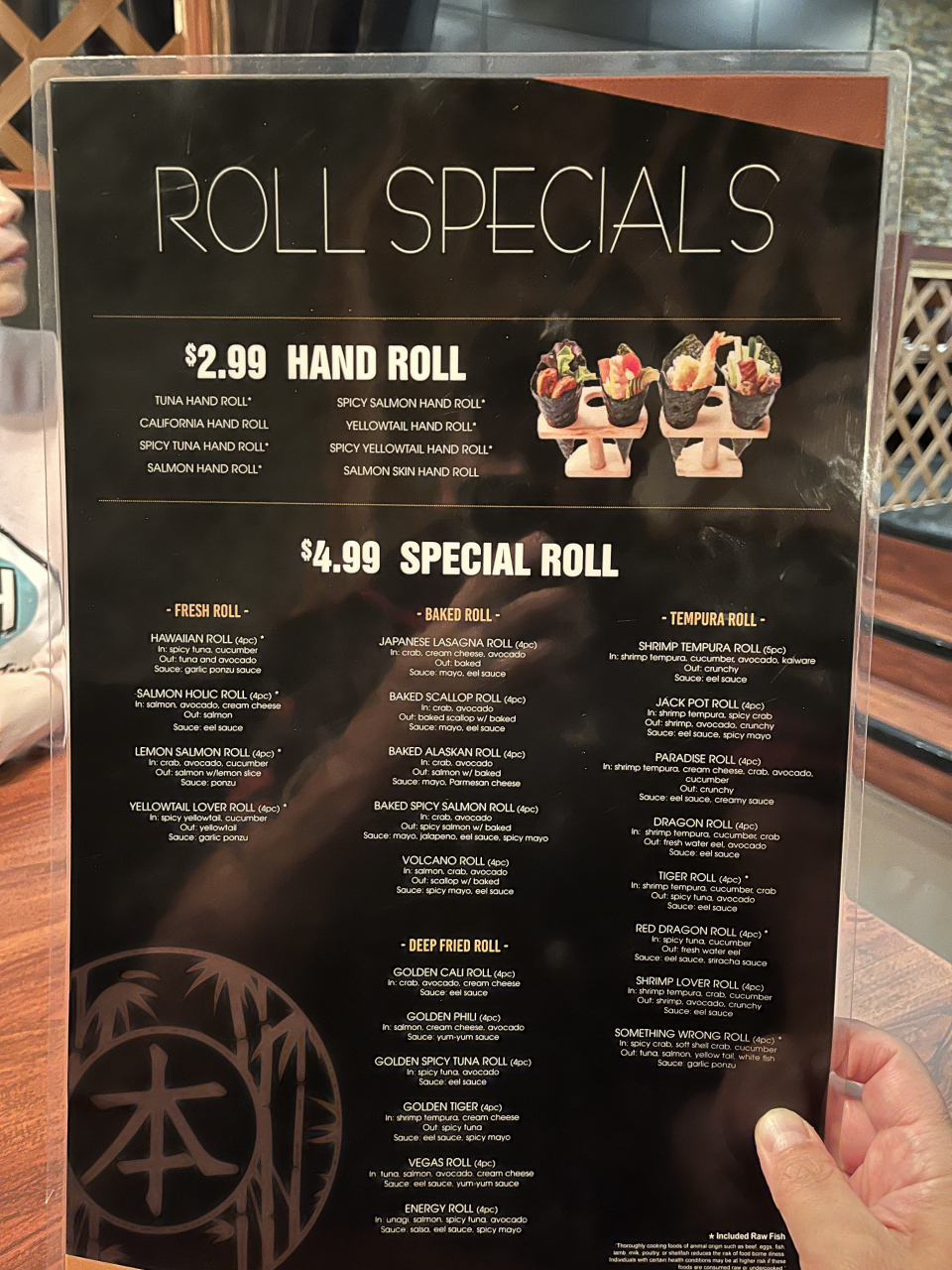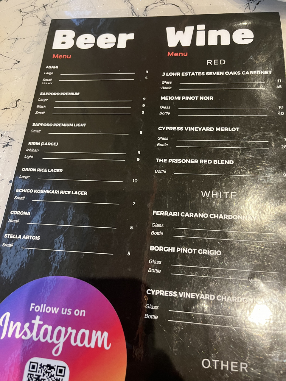 観光客の行くエリアではなく、観光エリアで働く地元の人が仕事の後に行きやすいロケーションに新しくオープンしたので行ってみました。ストリップ通りからもクルマで5分くらいの場所でスが、店内に観光客は見かけませんでした。オープンしたばかりのお店だったので、ハッピーアワーもかなりお得でした。寿司だけでなく串焼きも揃っています。