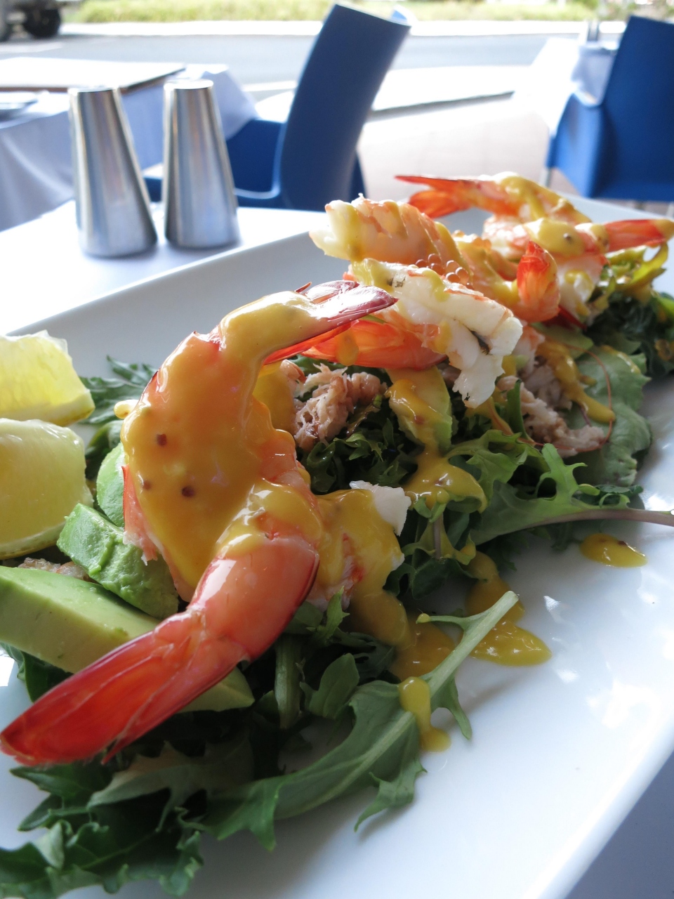 生牡蠣、バナナエビのサラダ、フライドポテト、バラマンディーのグリル、ボンゴレビアンコ、ビール&白ワイン、食後のデザートにブリュレ&エスプレッソを注文。