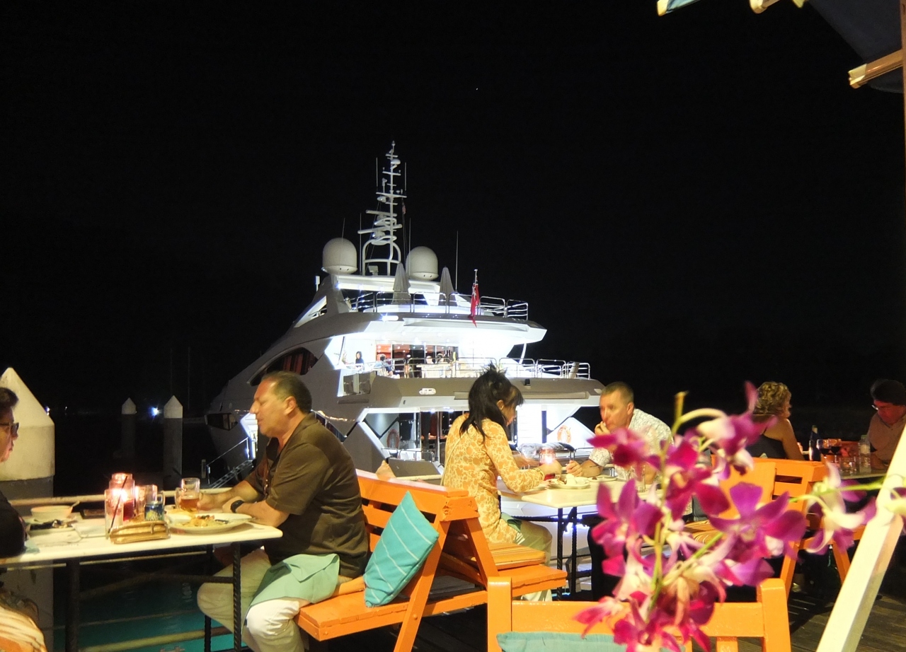 豪華ヨットと海を眺めながら、気持ちよく風に吹かれて食事が楽しめます。