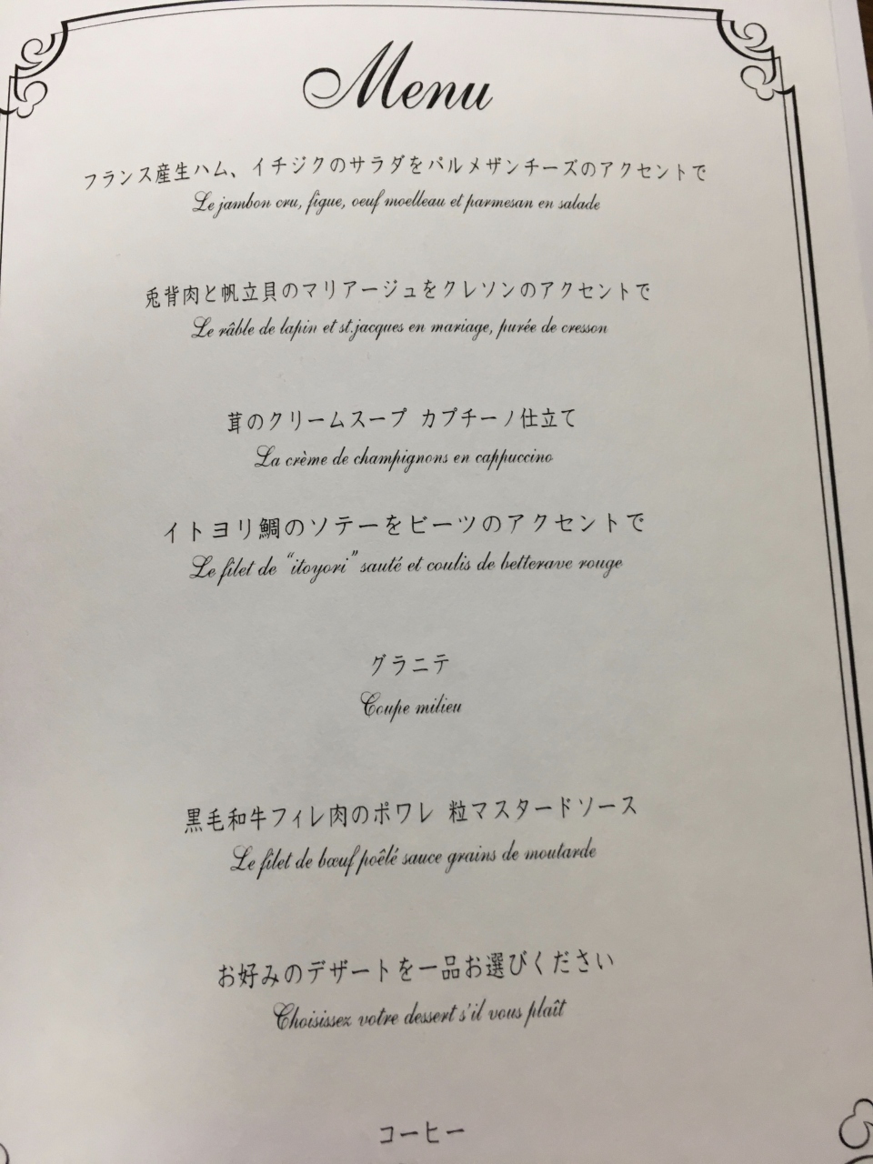 結婚記念日でしたので、記念日のディナーコース、シャンパン付き\15,000を窓際の席指定で予約しました(^^)