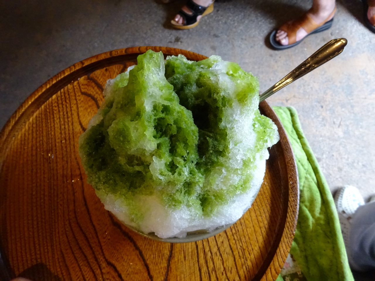 赤福氷は宇治のシロップの氷のなかに赤福のあんこと赤福のもちが2個入っていた。氷のなかにあってももちは固くなっていなかった。抹茶シロップは、抹茶というよりも、シロップという印象が強い。少し甘すぎ。あんこもあるので、もう少し甘さ控えめにするとか、本物の抹茶を中心に作るとかするとよいと思う。量的には、それなりの年齢のものにとってはやや多いように思うので、もう少し少なくして単価も低くするとよいと思う。- 旅行時期