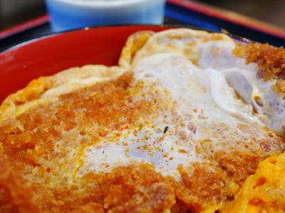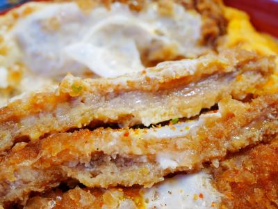 【三元豚ロースカツ丼セット】面積は大きいけど断面を見たらスカスカでハムかベーコンみたいな厚さの肉(笑) 肉汁たっぷり、脂身多め。セット内容は鶏ガラスープ。ウーロン茶または緑茶。大盛り無料。メイン料理もひどくて、セットにするとますます損をする内容。メニュー写真では肉の厚さ、肉質までは分からないのでどうしようもないです(笑)