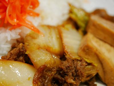 【すき焼きとカレーのWプレート】すき焼きの肉は他のすき焼きメニューを作る際に出た余りのボロボロ、パサパサ肉の寄せ集め。切り落としやこま切れの範疇にすら入らない本物の「クズ肉」でした。(※食べログに出ている他メニューの立派な肉と見比べて下さい)寄せ集めと言っても極小サイズがたったの2、3切れ。それに誤魔化して上手く盛っているけど実質糸こんにゃくが主役(^^; 案の定、煮詰まっているのか異常なしょっぱさ。カレーを食べる前にご飯が足りなくなりそうになる。カレーは業務用、社員食堂、学食と全く同じ味。