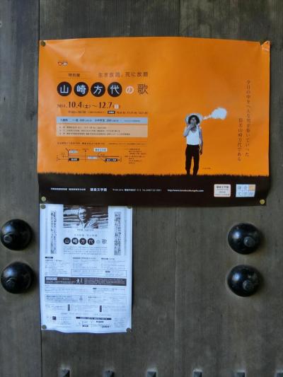 山門の扉に山崎方代の特別展のポスターが貼ってあります。なんでこの場所にと思います。しかも画鋲使ってますよ。木に穴開けて平気なんですか? 反対側の扉にも画鋲を使った跡がありますね。