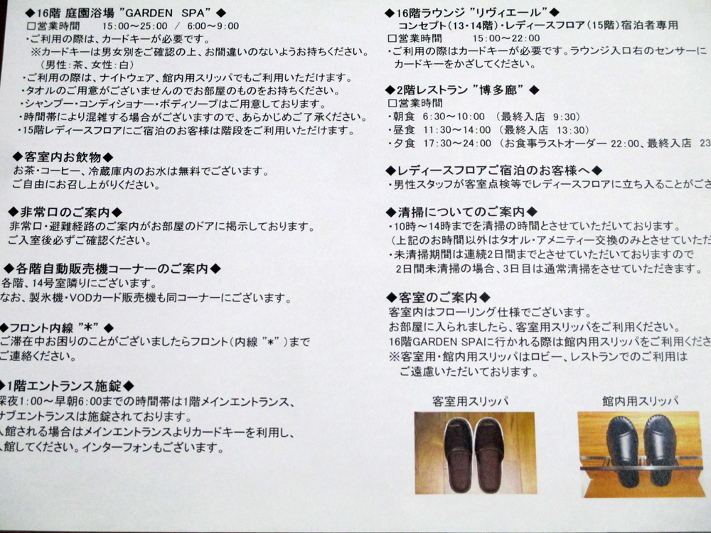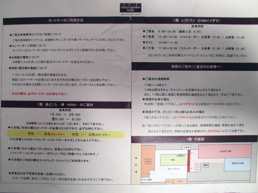 大阪プレミアと同じくB5の説明プリントあり。オープンしてから一週間程度だが、プリントを見ただけでも、こちらの方が一枚上手なのが分かる。朝、荷物だけ先に預けに来た時もすんなり。インの時は、並んでいる間に、荷物を引っ張り出してきてくれたので順番が来たらサインだけして終わり。連携も良くスムーズ。
