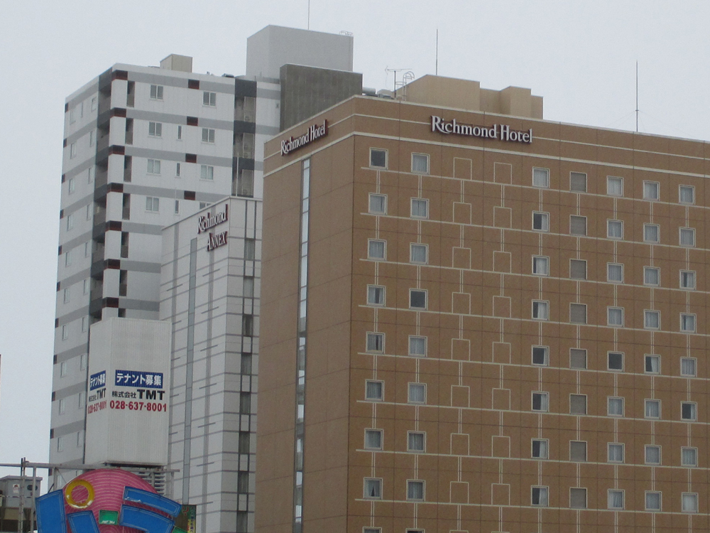 ホテルに到着して最初に驚いたのは、正面のリッチモンドホテル宇都宮駅前と裏の高層マンションに完全に挟まれていて正面の部屋も裏側の部屋も眺望がありません。日が沈んでからチェックインして、朝早く出ていく出張族御用達かしら?日の当たらないホテル特有のの辛気臭さがあり、私には合わなかった。とにかく予約サイトの外観写真と現実は全く違うのでご注意を。