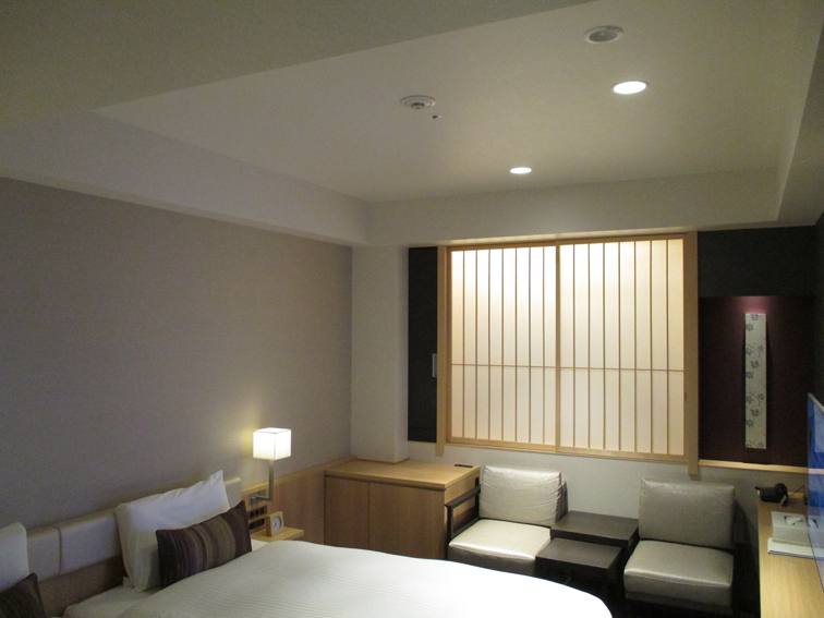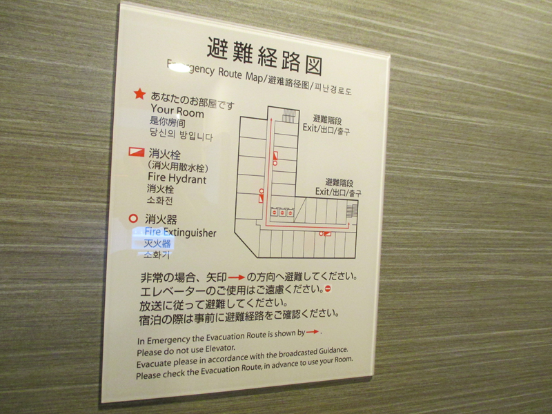 初めてだったので自動チェックイン機の使い方がよく分からない。でも手助け無し。フロアの真ん中にエスカレータが陣取っていて、フロントカウンターと自動チェックイン機がそこそこ離れている。チェックインが終わっても客室へ行くエレベーターがどこだか分からない。チェックイン機とエレベーターも離れているし、チェックイン機の位置からだと死角で分かりにくい。
