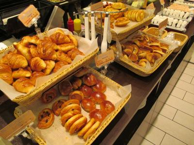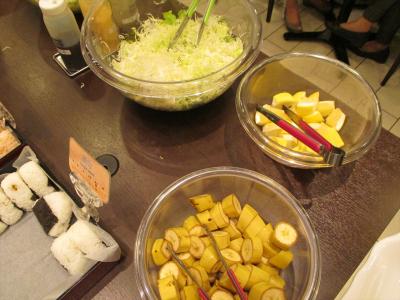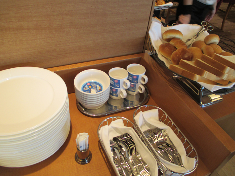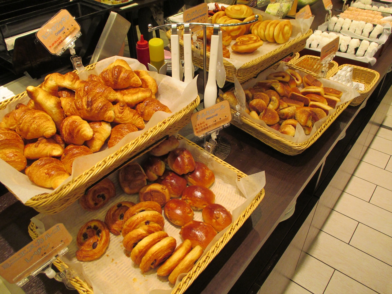 パン7種類 おにぎり4種類。ソーセージ サラダ(千切りキャベツが9割以上) バナナ オレンジ グレープフルーツ。飲み物各種。いつもの事ですが、苦いグレープフルーツが徹底的に敬遠されて残ってます。オレンジ食べたかった(´Д⊂ヽ- 旅行時期