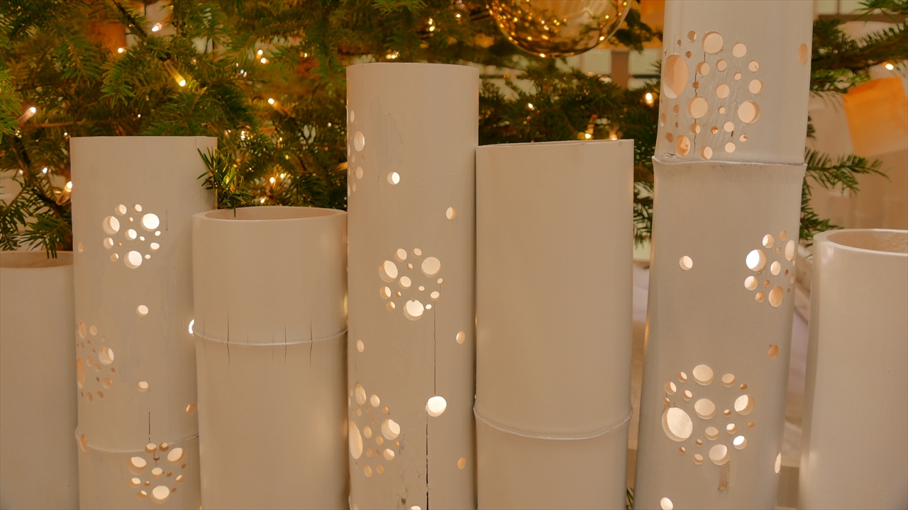 離れて全体を撮っているだけなら気付かないでしょうが、近くに寄って見ると単純で初歩的な模様の穴しか開けてないのに亀裂の走った杜撰な作品だらけ。原因は腕が悪いか、道具が悪いか、質の悪い竹を掴まされたか?なんにせよ、人様にお見せするレベルに達してません。色に関しても白い竹、違和感ありすぎです。竹に雪が降り積もった情景ならきちんとそういう表現をするべきで、白のベタ塗りとかとんでもない手抜き。これなら「従業員が作る必要が本当にあったのか?」とか「わざわざ無理して竹を使う必要無し」と思ってしまいます。