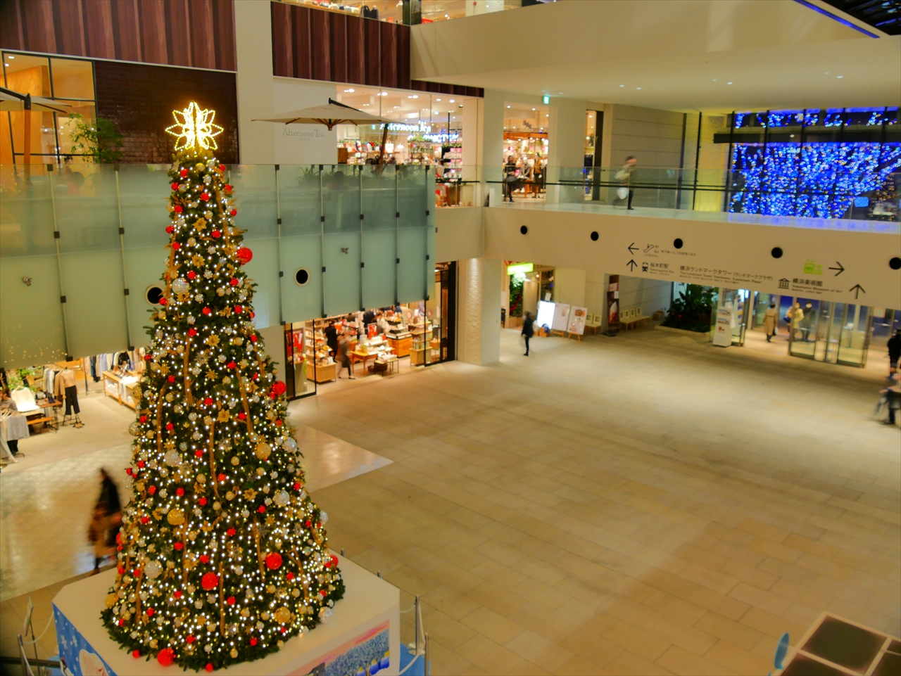 みなとみらい駅直結で少なくともみなとみらい線利用者はどんな悪天候にも左右されずに利用できて便利なはずですが祝日にもかかわらず閑散としています。JR最寄り駅である桜木町からは一番遠い商業施設。催されるイベントも弱い。ツリーも普通でこれといって特徴が無く混む要素が見当たりません。穴場です(^^;