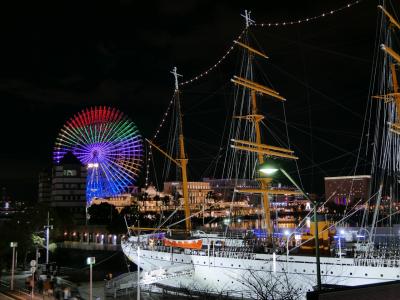 七色と宣伝してるけど公式ページの水色から赤までこんなくっきりした7色同時は見られませんでした。青なら青系のグラデ―ション、赤なら赤系のグラーデ―ションとして光っている時間が長い。同時に最大6色までは写るかも。背景に小さくベイブリッジ、入れようと思えばマリンタワーも隅っこに入ります。でも1カット撮っただけで飽きました(^^;- 旅行時期