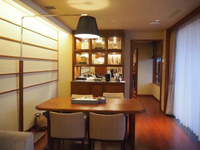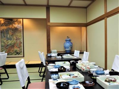 鉄板焼き以外の朝食や夕食は、料理屋「水白」の指定された部屋で提供されます。窓のないお部屋では少し閉塞感を感じるかもしれません。鉄板焼きの場合は、「水白」を通り抜けて一度外に出る必要があり、そこで草履に履き替えるのですが、少し古くて履くのが気になりました。