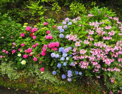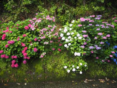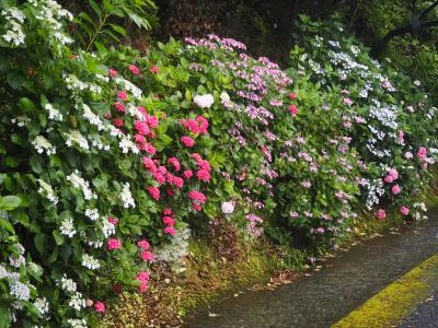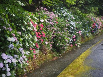 およそ80種類、100株以上の紫陽花が100メートルにわたり咲き誇っています。この紫陽花は近所に住む山田さんご夫妻が、17年ほど前から育てていて地元の人からは「山田さん家のあじさい」と呼ばれて親しまれています。