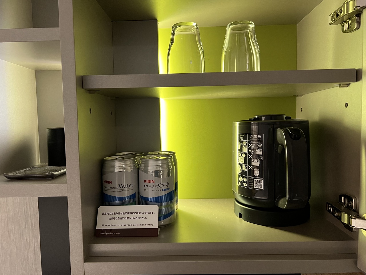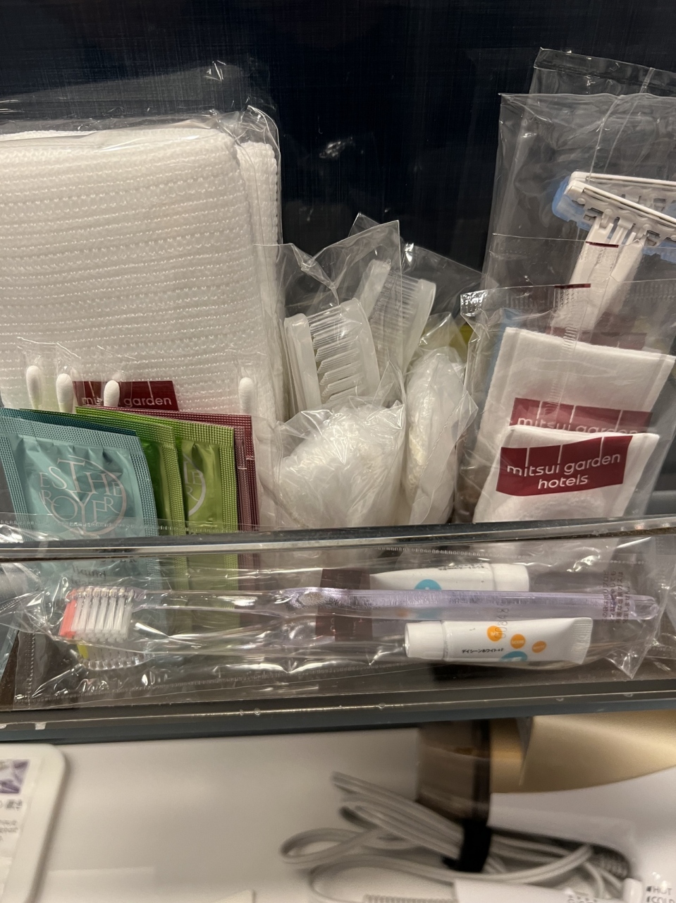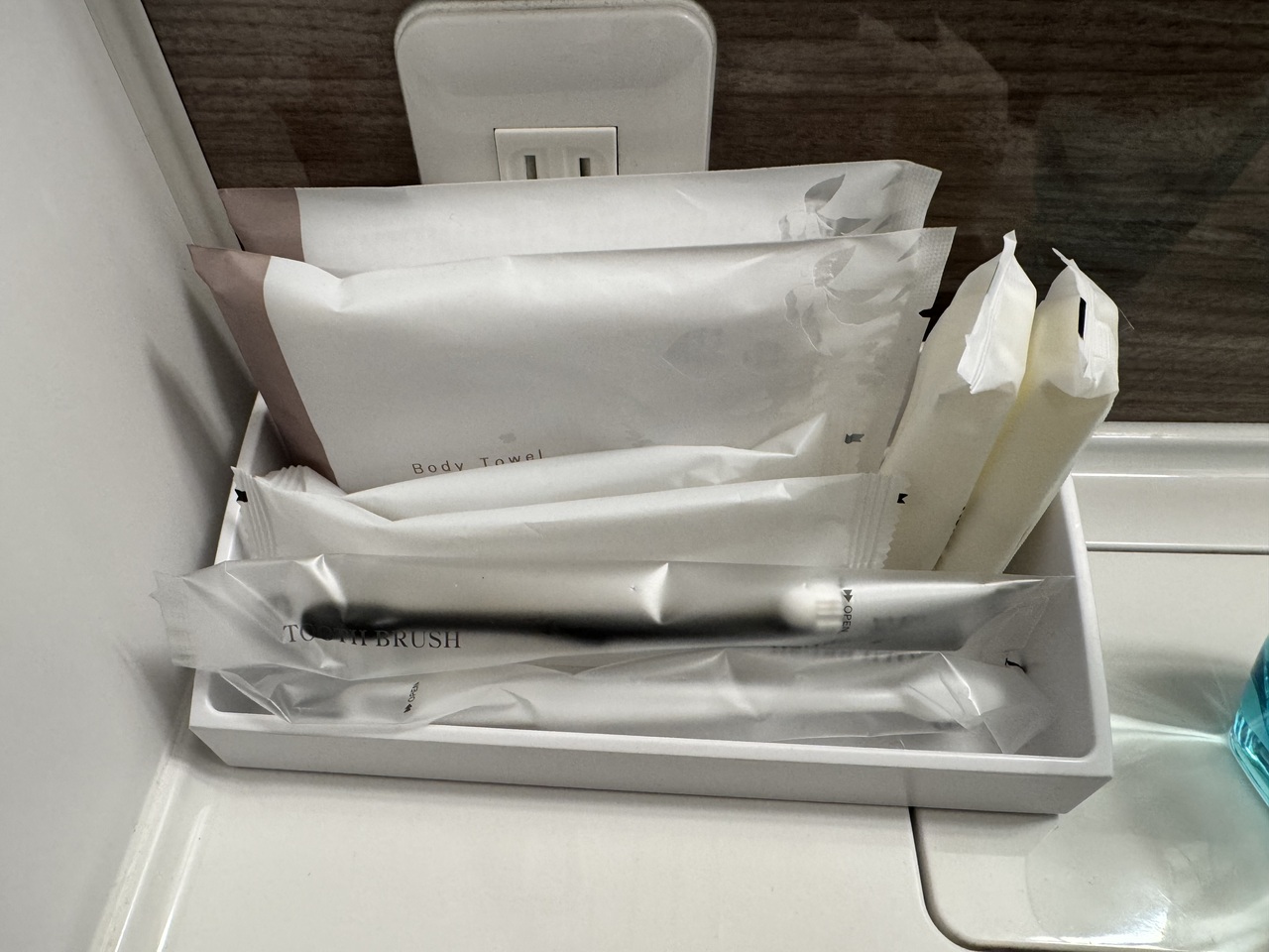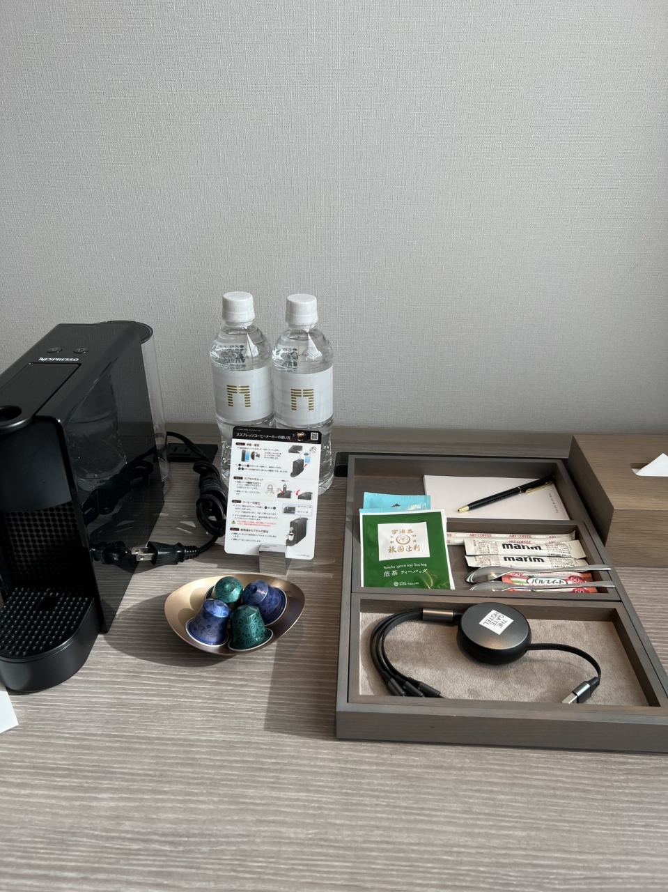 アメニティはロビーのアメニティバーからピックアップ、化粧品やコーヒーお茶も揃っていてなかなか充実していました