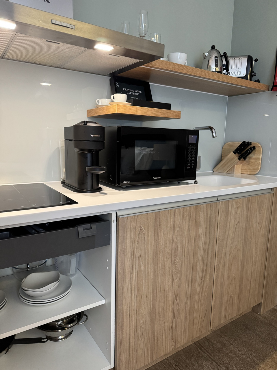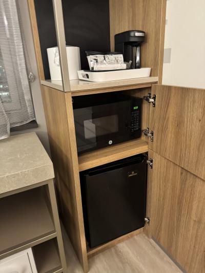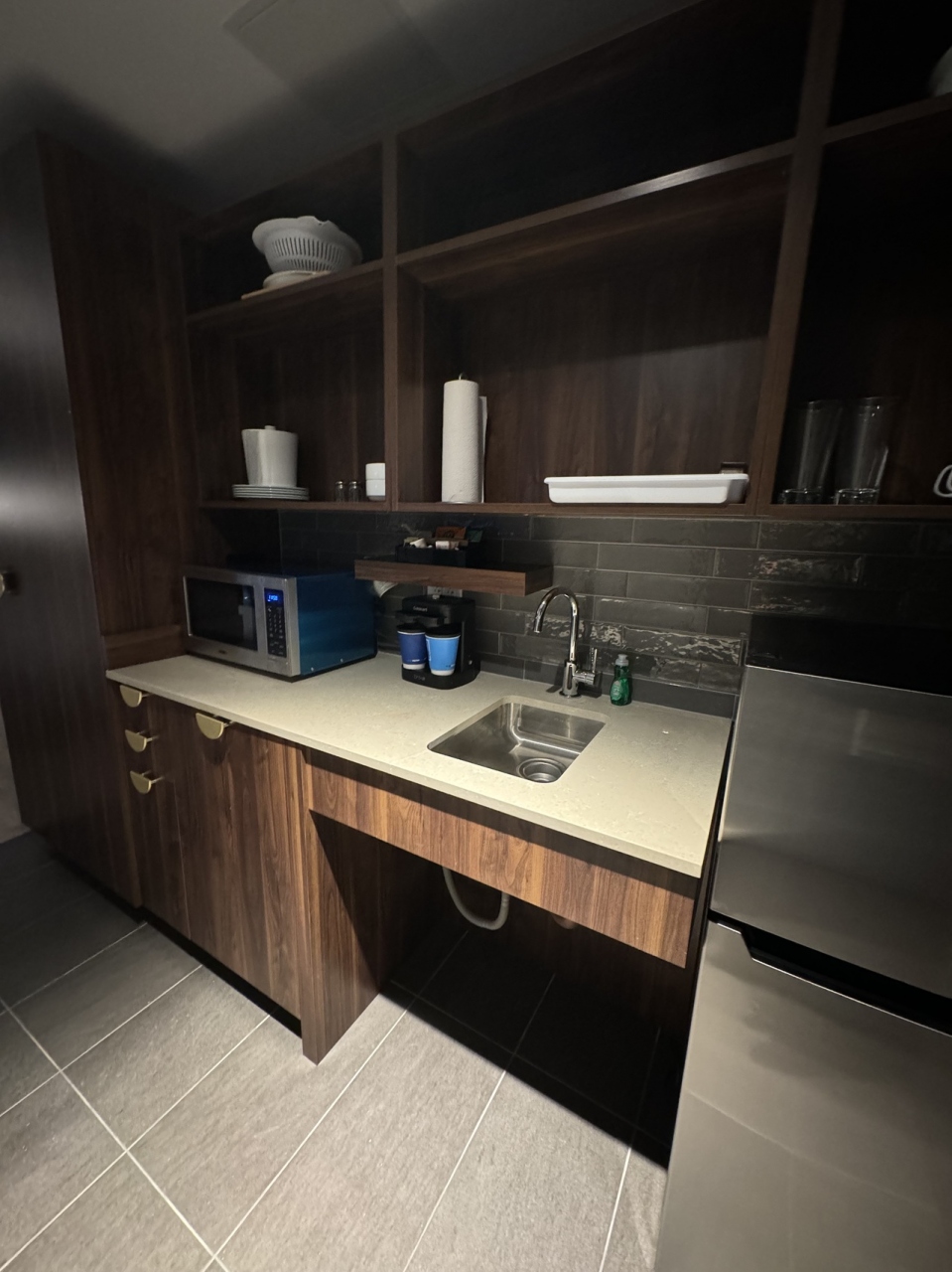 ホーム2スイーツの方が部屋が広くフルキッチンですが、こちらは電子レンジと冷蔵庫は付いてますが食器や流し台はなく、部屋はコンパクトです