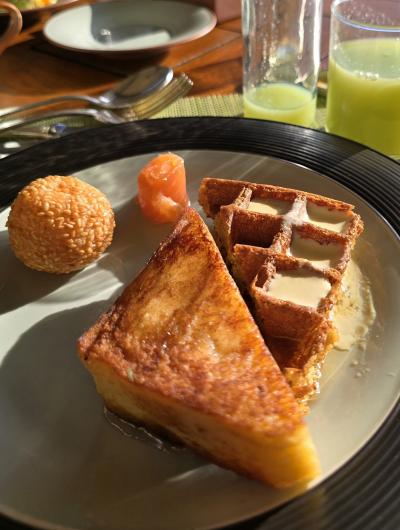 点心と、フレンチトースト、ワッフル。ジュースも更に持ってくる。