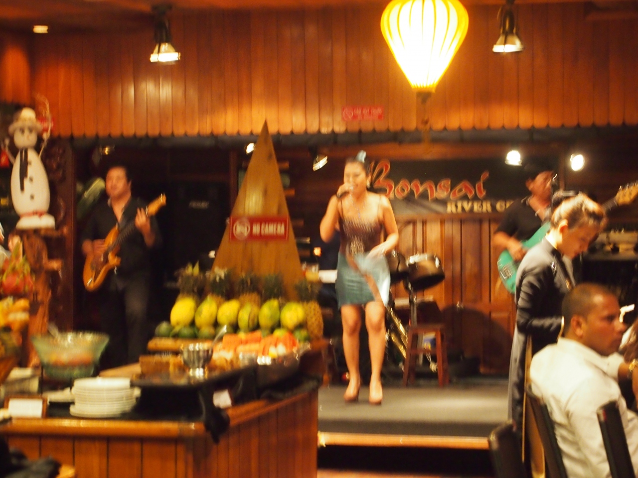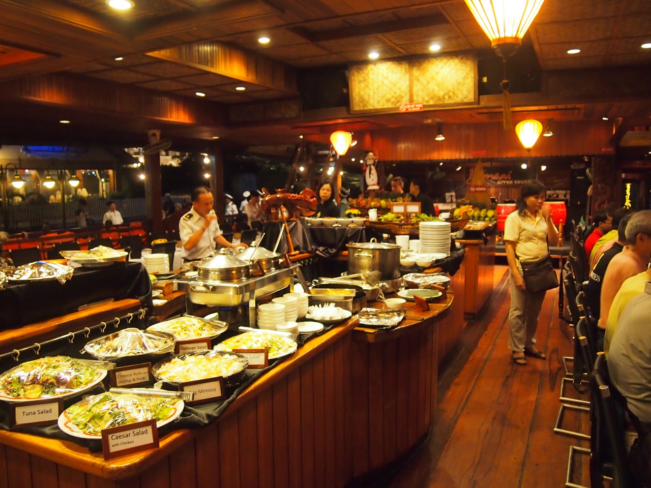 ビュッフェ料理は、ステーキやパスタ、シーフード、中華など種類も多い。西洋人のグループが多かった。座席は決まっていて、ビュッフェもさほど混まない。食事が終わるころベトナムの民族音楽が始まり、その後フィリピン人バンドの音楽ショーになり、盛り上がる。食事も音楽もそれなりに楽しめた。