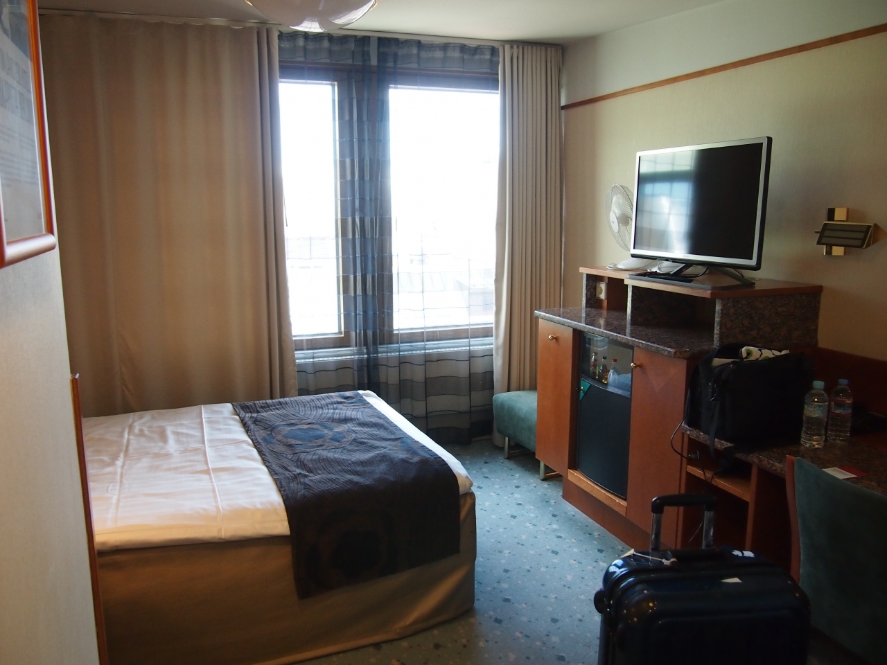 ホテルは現代的なビル。ツインの部屋は北欧らしい白木の内装で、現代的なデザイン。洗面室には、バスタブはなかったが、トイレ、横に長いカウンターで使いやすい洗面台と、ガラスで仕切られたシャワーブースがあり、十分な広さがあり清潔感がある。