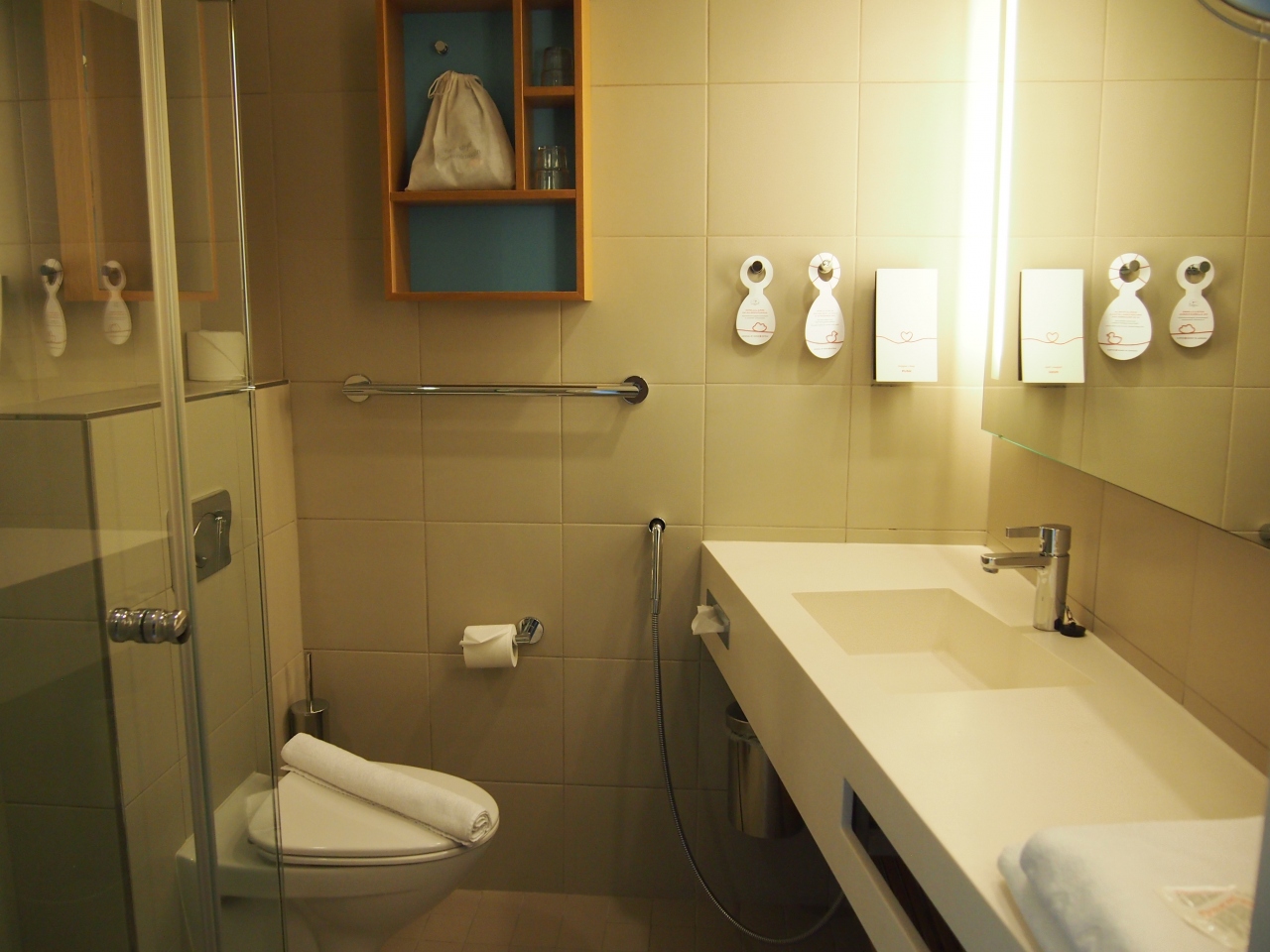 部屋は、日本のビジネスホテルの部屋より若干広いだけだが、洗面室は十分広く、シャワーブースと、やや広い洗面台、トイレの構成で、バスタブはないが気持ちよく使える。使い捨てスリッパやバスローブもある。WIFIは無料。2回宿泊したが、一度目はエコノミーシングル、かなり狭く、小さなサイドボードがあるだけでデスクも冷蔵庫もなかった。2度目は、スタンダードツイン、やや広くデスクがあり、冷蔵庫もあった。