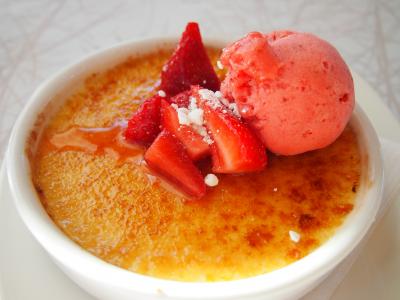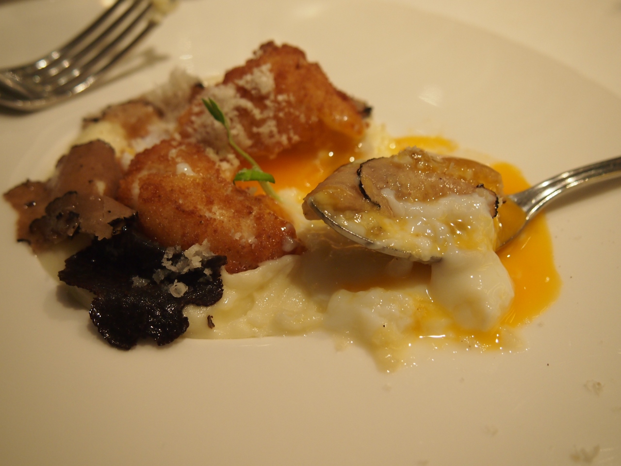 ミートボールのような大きさのコロッケのアミューズ、冷たいニンジンのスープ、牛肉のたたきの料理、とろけるトリュフの卵料理、ラビオリ、魚のクリームソース、クリームブリュレ。クリームソースが多いが、とろけるほどおいしい。