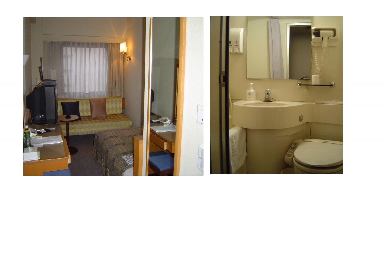 ダブルルームに泊まったが、ビジネスホテルにしては十分広い。ベッドの左右にサイドボードが置け、窓側に椅子とテーブル、壁側にドレッサー兼机があるが、余裕スペースがある。バスルームは、ユニットで特に広くは無いが体がぶつかるようなことは無い。
