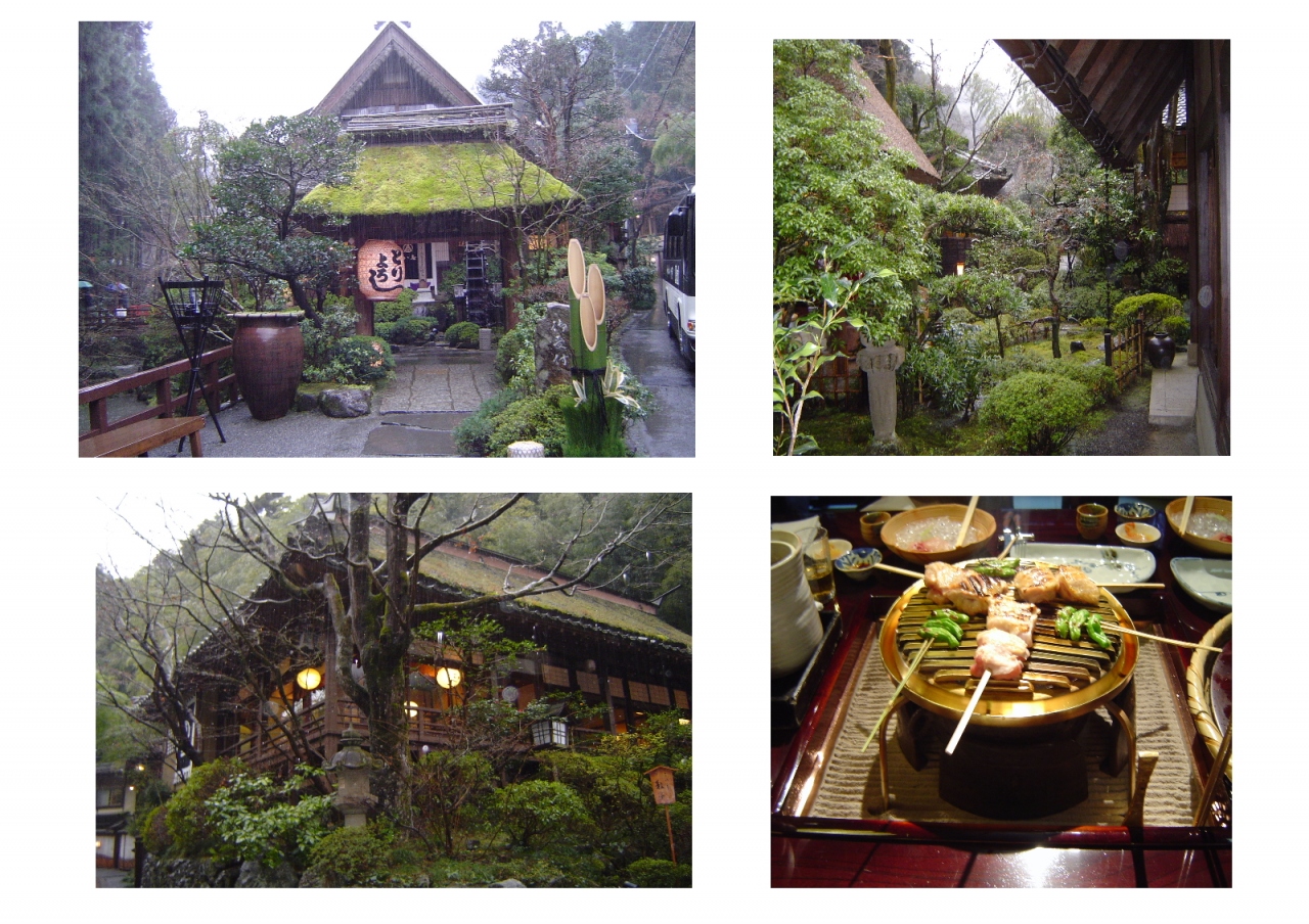 飛騨高山から移築した合掌造りの建物をはじめ、4−6人程度の離れの建物が何十棟も小さな渓谷沿いに点在している。大人数(50人程度)用の建物もある。離れの建物は、どれも本物の日本建築で、赤松の床柱や網代張りの天井、杉板の天井板、銅版葺の屋根、木の引き戸など、凝った作りだ。紅葉の時期が一番人気。梅雨時には「蛍祭り」が開かれ、敷地内の電灯が消された中に、たくさんの蛍が放たれ幻想的になる。春の梅、冬の雪景色も良い。