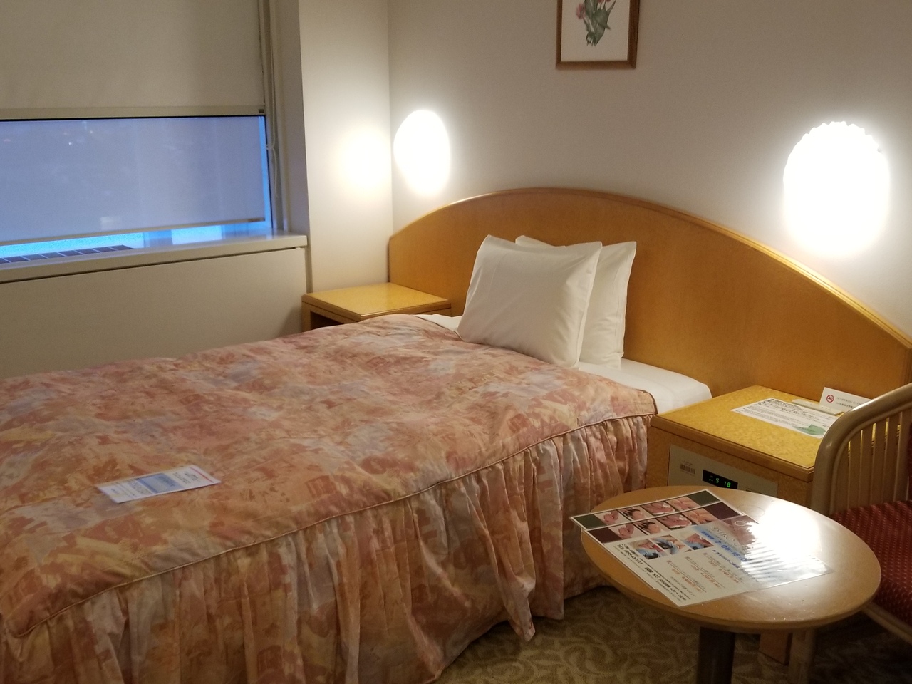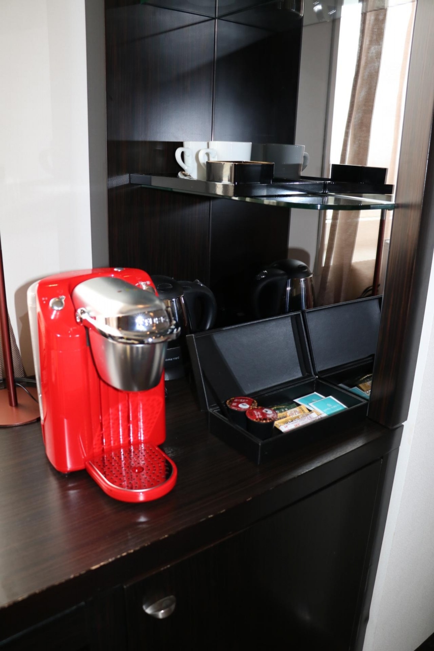 アコーホテル・ゴールドメンバーの特典として、スタンダード・クイーンからプリビレッジ・クイーンルームへUGしてもらった。13-15階の上層階がプリビレッジルーム。21平米の部屋は、普通のビジネスホテルより若干広い。カウンター兼用のデスクの端に棚があり、真っ赤なエスプレッソマシーンと無料のコーヒーカプセル2個、コップ類があった。カウンター下の冷蔵庫に、水2本、ジュース2本、ペリエ1本があり、冷蔵庫内の飲み物は無料だった。