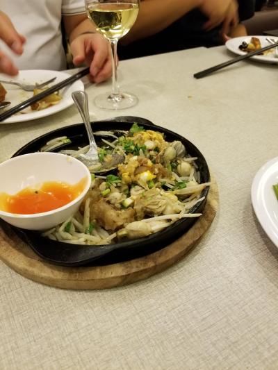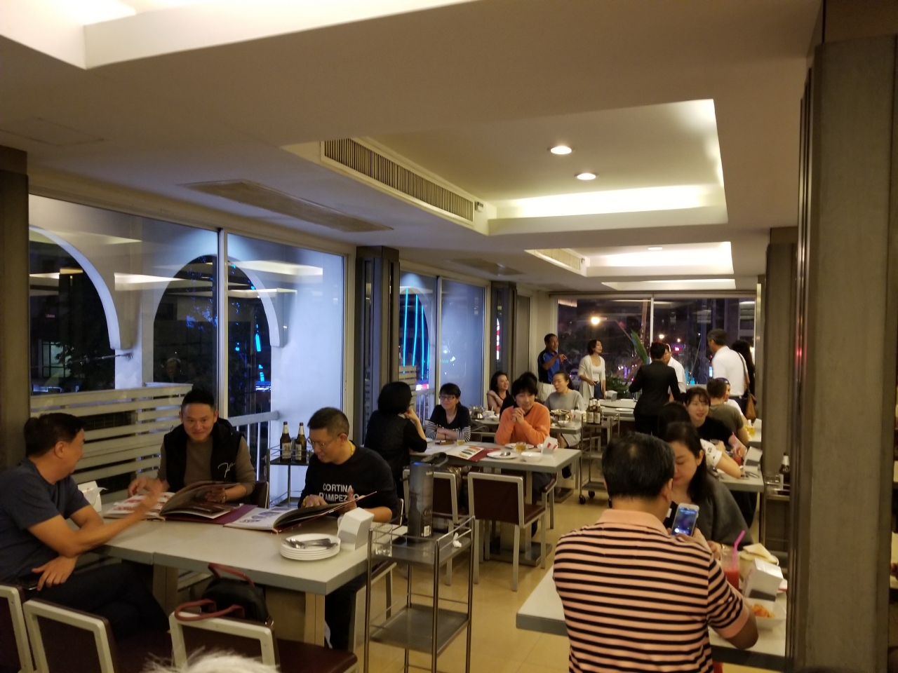 土曜日夜で7名のため、日本からホームページで予約した。パッポン付近のルメリディアンホテルに泊まっていたので歩いて5分程度で到着。ビル全体が店で席が多いが、18時の予約時間に行くと満席で、10分ほど待って着席。フロア毎にマネージャー数名とボーイとウェイトレス多数がいてテキパキして英語も通じる。7名が各々1品づつ頼んだ。野菜炒めや春雨などは中華や韓国のそれに似ていて、中華の味を想像したが、全て違うタイ風の味。思うような味ではなかったが、メニューは多く、値段もリーゾナブル、活気もあって良かった。ビール、ワイン、料理7皿を7名で割って、1人4,000円程だった。