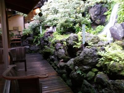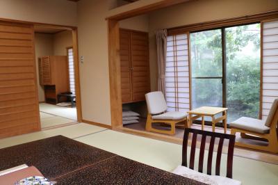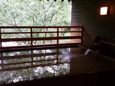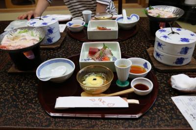 木造旅館で、やや古いが、新館もある。次の間付和室に家内と宿泊。2間続きの和室は十分な広さで、角部屋だった。池のある庭と街中が各々2方向の窓から見える。雨が多い今年の夏だからか池に面しているからか湿気があったこと以外は、木造旅館らしい落ち着いた部屋。