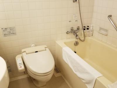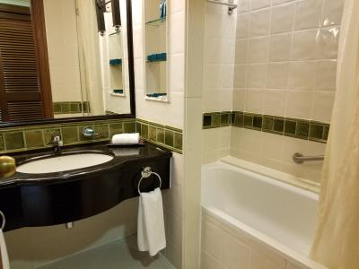 バスルームは、広さはビジネスホテル並みだが、洗面カウンターにタオルをかけるバーが長く付き、カウンター下はタオル類の籠があり、デザインはシティホテルっぽい。アメニティは、専用のバスジェル、シャンプー類と、バスソルトやコットンもあった。
