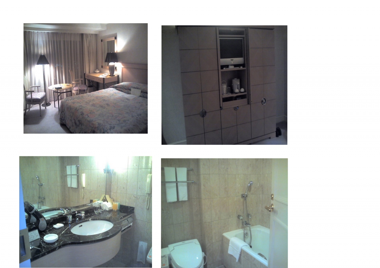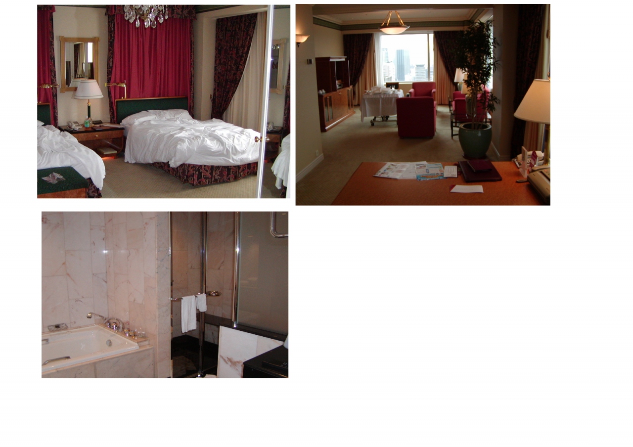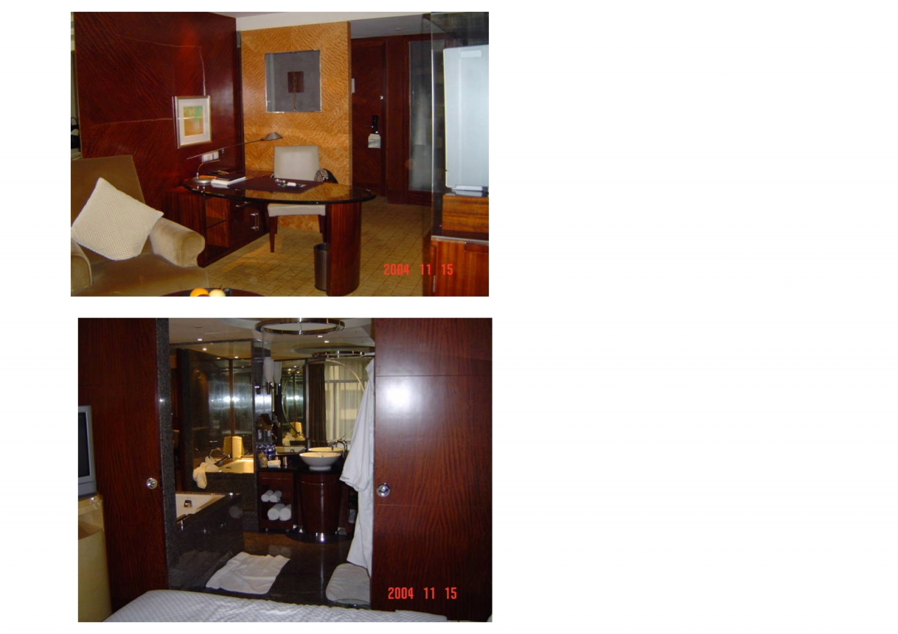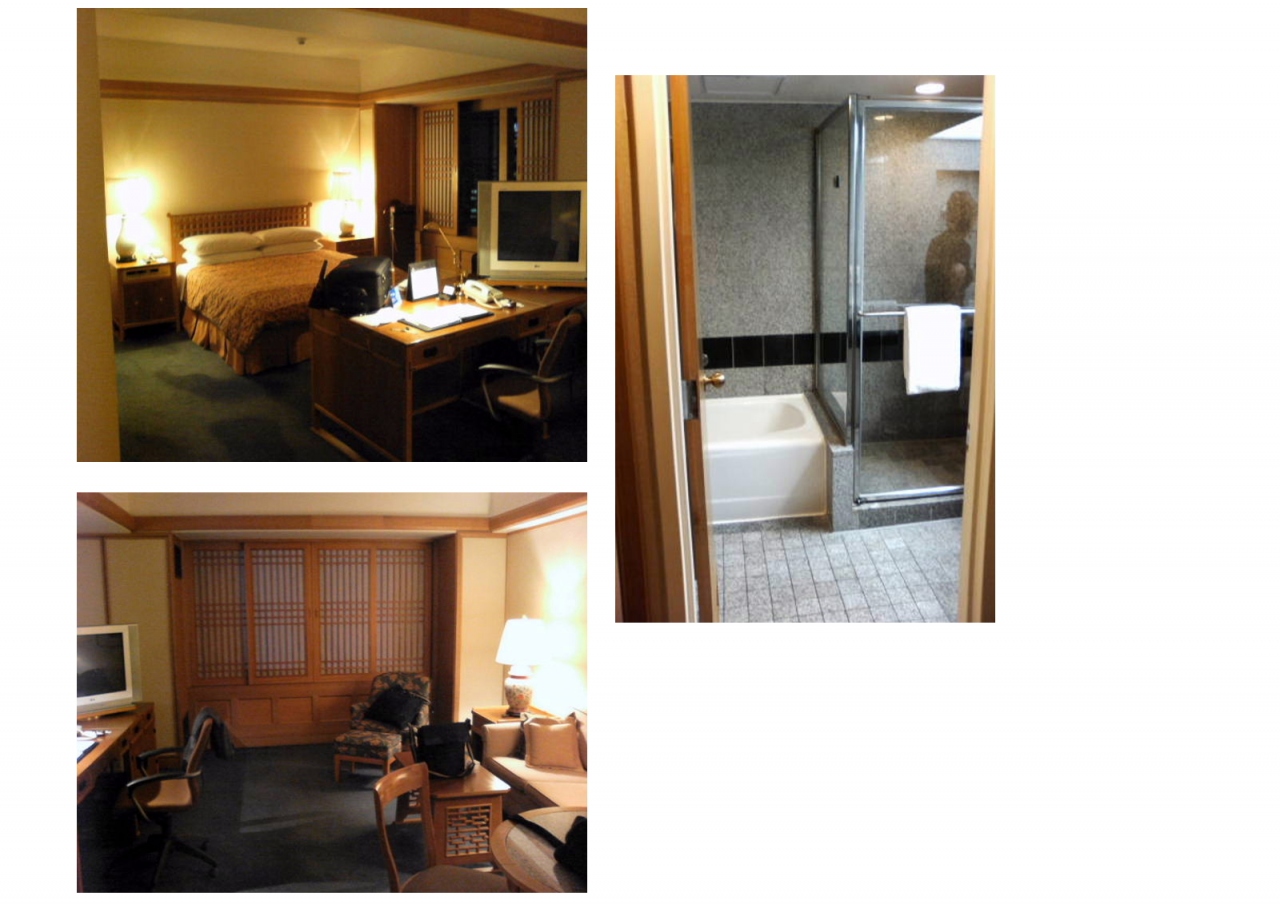 部屋は、狭いながらも、リビングルームとベッドルームの2部屋に分かれており、リビングルームは大きな仕事用デスクとソファがある。ベッドルームは、引き戸でバスルームと一体につながる。バスルームは大理石張りで豪華で8畳くらいあり、独立したシャワーブース、段上にあるバスタブ、豪華な洗面台がある。