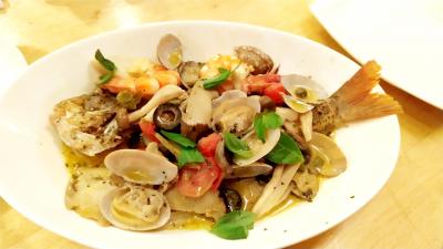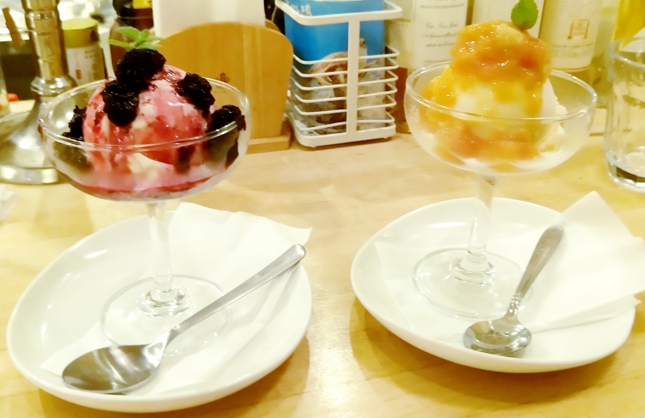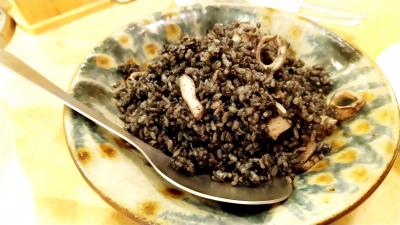 新鮮な島素材で作るイタリアンが人気の「島むん+」を予約して利用。予約が取り難いお店なんですが、コロナのおかげで当日予約(カウンター席)OKでした。店内もオシャレですぅ♪白ワインで♪(*^^)o∀*∀o(^^*)♪カンパーイ焼きトコブシとアサヒィ(大きめの貝)貝の旨味が凝縮!トコブシはコリコリ、アサヒィはもう少し弾力がある感じ。夜光貝のソテーに島魚のアクアパッツァが来ました♪(^o^) メインの魚は「フエフキダイ」の仲間だそうです。もう言うことありません!めっちゃ美味しい!!(*≧▽≦)ノシメは、イカスミ炒飯。はい、リゾットではなく、チャーハンです。これがまた、ビックリするほど美味しい!イカスミ特有の磯臭やクセが全く無く、あるのはコクと旨味だけ。噛みしめるとほのかな甘みも感じられ、これは逸品!名物と呼ばれるだけあります。かなりお腹いっぱいでしたが、娘と奪い合うように完食!(笑)デザートは、手作りジャムのソースが掛かったアイスクリーム。ジャンボ桑の実(左)とタンカン(右)です。桑の実は、野趣溢れる味でつぶつぶ感がたまりません。タンカンは柑橘系の爽やかな香りで美味でした♪(^o^) これだけ食べて、これまたビックリするほどお安かったです。ごちそうさまでした。