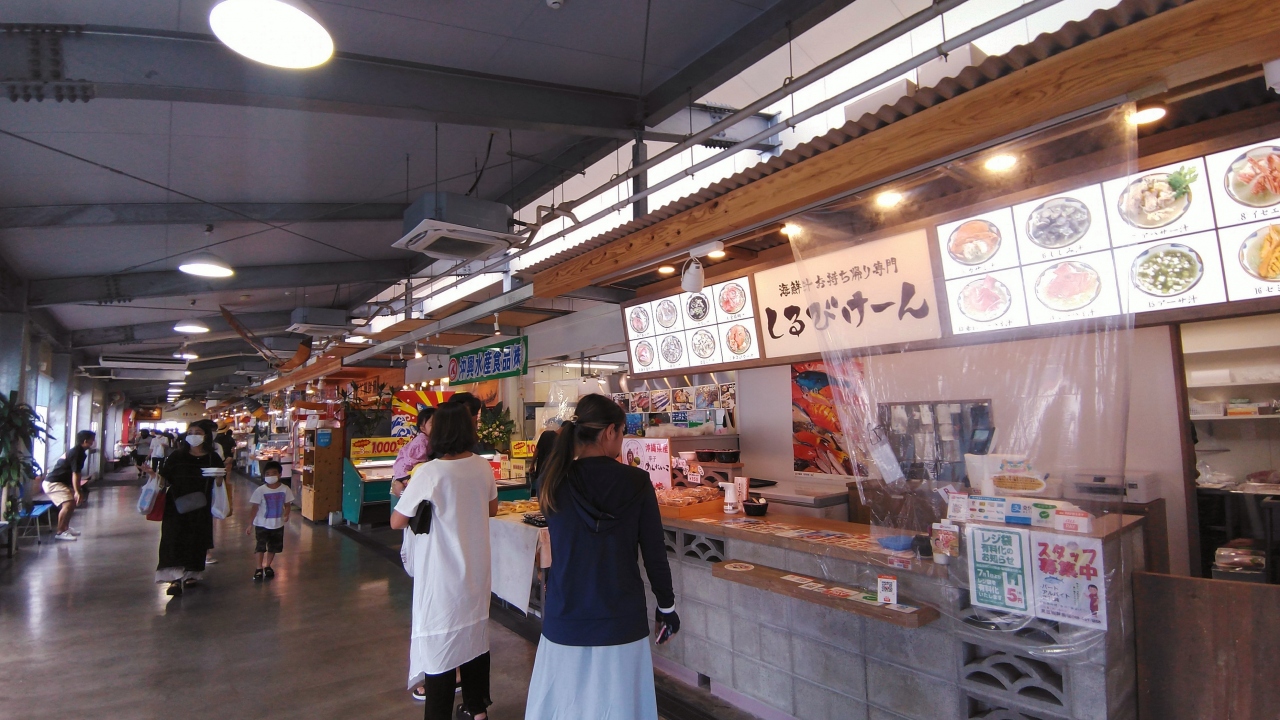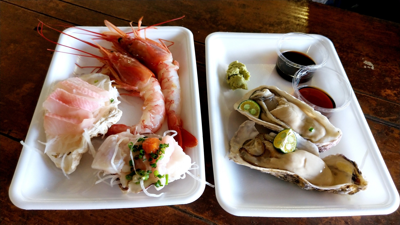 ここのお魚センターは、小分けのお刺身がパック売りorバラ売りされているので、赤エビ1本とか牡蠣一個から購入できます。ごはん屋さんと味噌汁やさんもあるので、お刺身定食や勝手丼が作れちゃいます。値段は、お店によって若干違うので、よく見て買いましょう。買った刺し身は、外のテラス…というより巨大テントで座って食べることもできます。