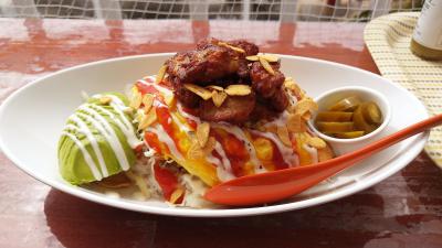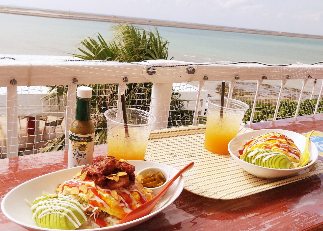 オムレツ+タコライス=オムタコライス アボカドのトッピングに、マンゴージュースを頼みました。娘さんは、ガーリックチキンとアボカド、ハラペーニョのトッピング。美味しいランチにきれいな景色、最高です!目の前の海でウインドサーフィンをしている人たちを見たり、那覇空港に発着する飛行機を眺めたり、のんびり楽しむことができます。- 旅行時期