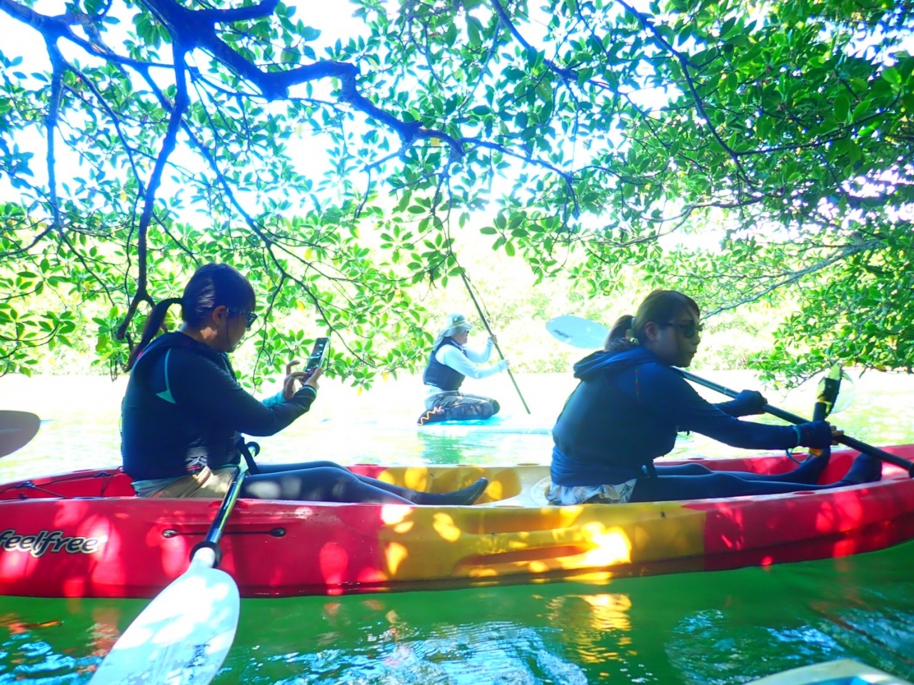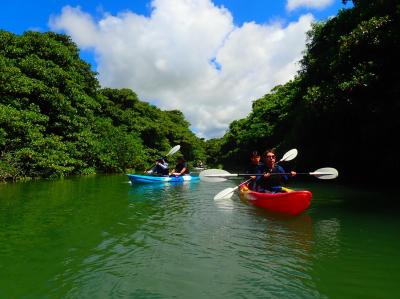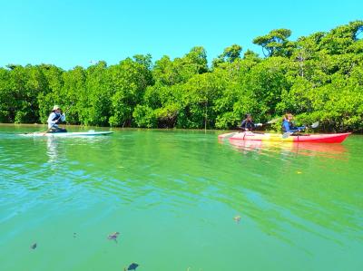 「天然記念物マングローブSUPorカヌー&青の洞窟シュノーケリング」の1日ツアーに申し込んでいます。ホテルまでお迎え&ピックアップしてもらい、宮良川のヒルギ林に向かいます。ヒルギとは、マングローブのこと。なので、ヒルギ林は、マングローブの林?森って感じかな?宮良川は、波のない静かな川です。私と娘はカヌーで、友人はSUP(スタンドアップパドルボート)にチャレンジ!操作に慣れたところで、マングローブの林の中に突入。木陰は涼しくて、いい気持ちです♪あっという間の2時間でした!お天気も良く、サイコーのリアル「ジャングルクルーズ」でした!\(^o^)/