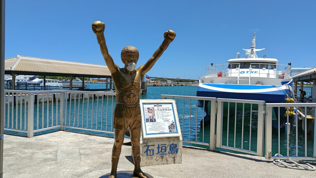 午後からのツアー集合場所になっていたので訪問。今回は3泊4日とショートステイなので、石垣オンリーで離島には行きませんが、八重山諸島や離島に向かう船はここから出発します。乗船場には、お約束の「具志堅さん」の像。今じゃお笑いの人ですが、かつては「世界チャンピオン」ですから。今でも石垣の「ヒーロー」なんでしょうね。その具志堅さん、ちゃんとマスクしてました(笑)