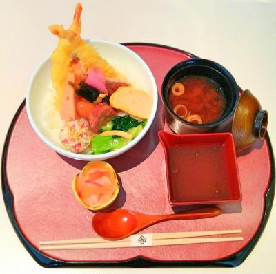 食事は葛あんかけ天丼を頼みました。右下の赤い容器に入っているのが、吉野葛あんです。なかなか美味しかったのですが、接客のお粗末さでかなり減点になりました。- 旅行時期