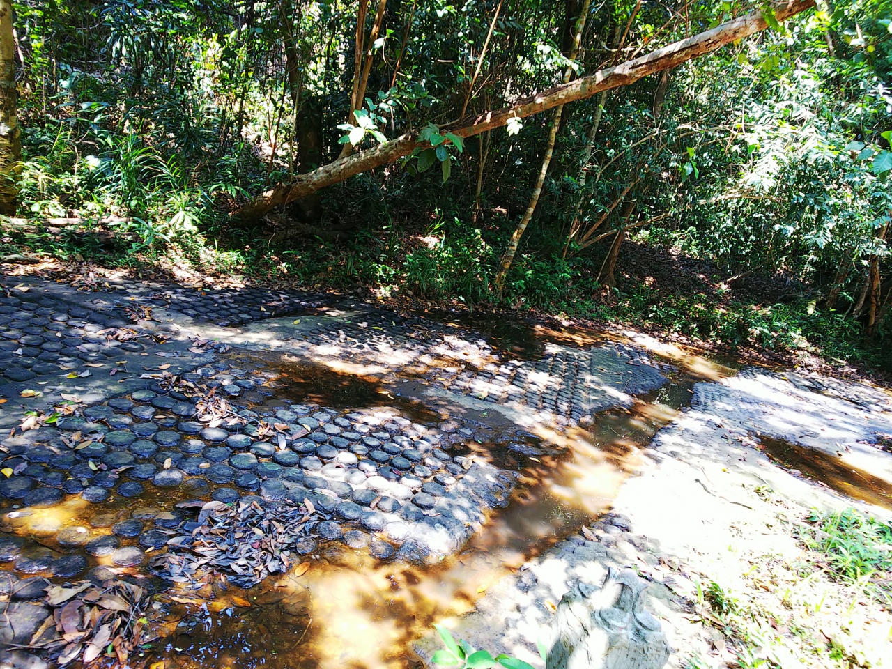 シェムリアップの街中からバスで小一時間、水の遺跡「クバール スピアン」に到着します。到着したとはいえ、遺跡は山の中。ここから、トレッキングもどきの山歩きをだいたい40分ほどかけて遺跡見学をします。