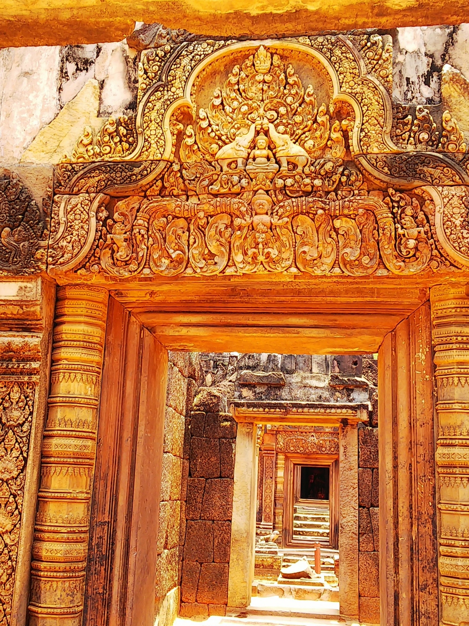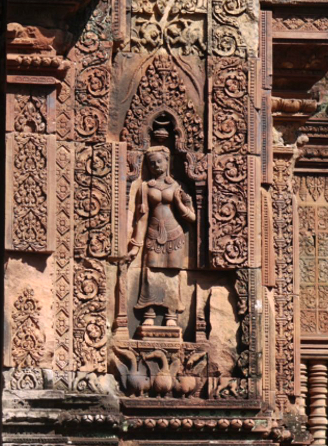 左右にリンガが並ぶ参道を抜け、塔門に入ります。各レリーフには、ヒンドゥー教の神話が、とても緻密&立体的に彫られています。特にバンテアイ スレイの彫刻は、クメール美術の最高峰と言われるだけあって とても美しい遺跡です。そのなかでも、特に有名なのが「東洋のモナリザ」と呼ばれる美人デバター。ただし、すぐ側まで寄って見ることが出来ないので、写真を撮りたい方は、それなりのレンズをお持ちになったほうがいいと思います。- 旅行時期