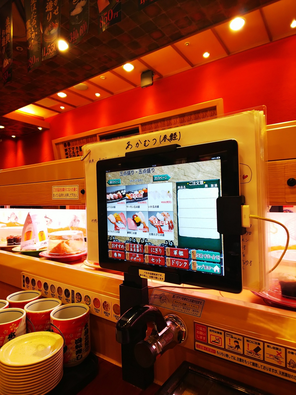 注文は、タッチパネルで頼みます。写真に値段がついているので、外国からのお客様にも分かりやすいんじゃないかな。さらに、タッチパネルの上にレールがあり、頼んだお寿司は「新幹線」に乗って運ばれてきます(笑)